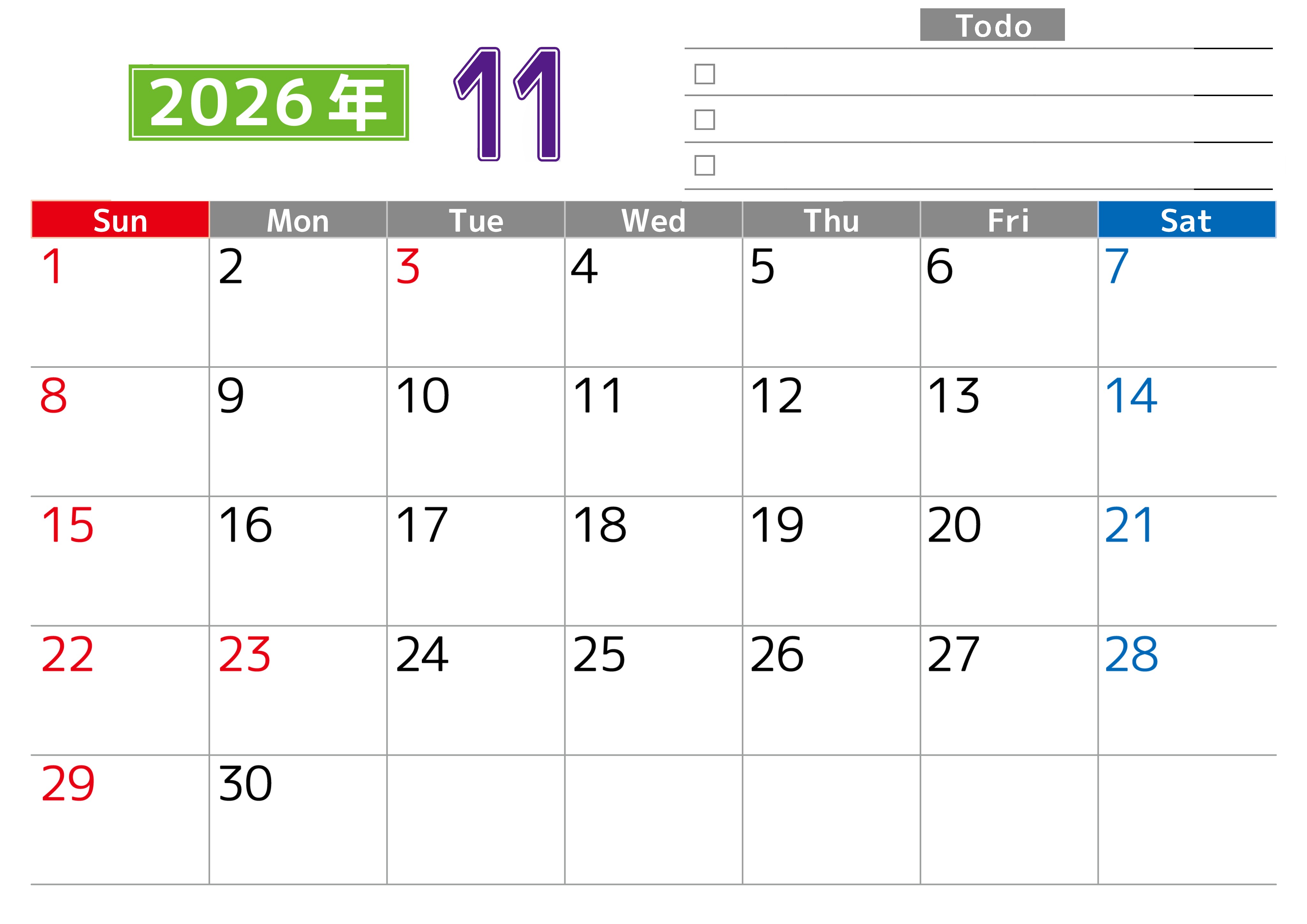 2026年・無料のカレンダーテンプレート 2026年11月カレンダーは横型日曜始まりで使いやすい!ToDoリストに色々書き込んでモチベ維持:無料(2026-01481100) 素材状デザイン王 2025年4月12日 2026年11月カレンダーは横型日曜始まりで使いやすいです。ToDoリストに色々書き込んでモチベーションの維持もしやすくなります。無料でダウンロードをしてすぐ印刷が可能です。)(2026-01481100) 11月 横型のカレンダー 日曜始まり ToDoリスト カレンダーデザイン-0148