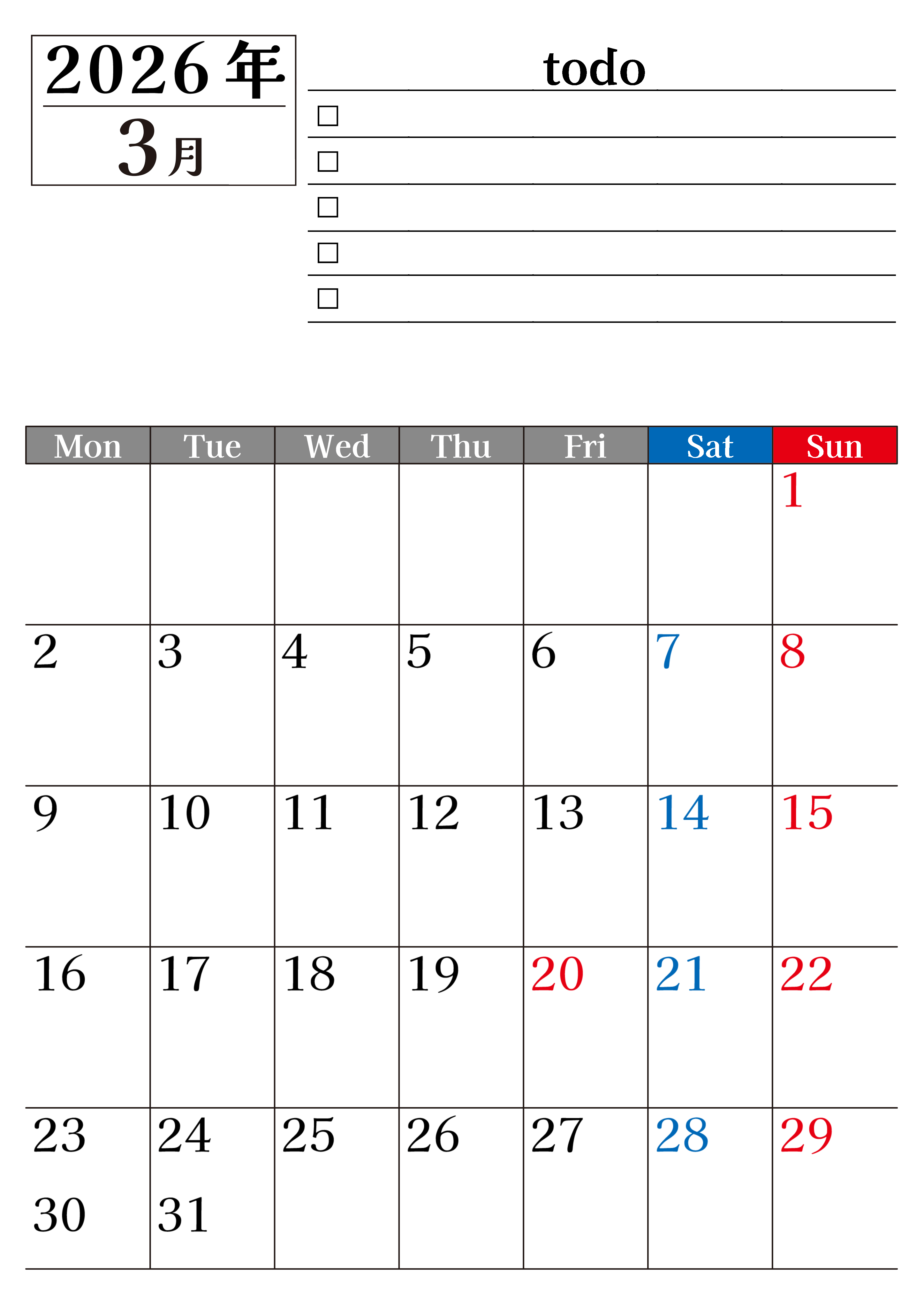 2026年3月カレンダーは縦型月曜始まりのToDoリスト付き無料のフリー素材です。資格や受験勉強の計画にぴったりなので継続したいものがある人に役立つカレンダーです。無料ダウンロードはすぐにできます。(2026-01490311)