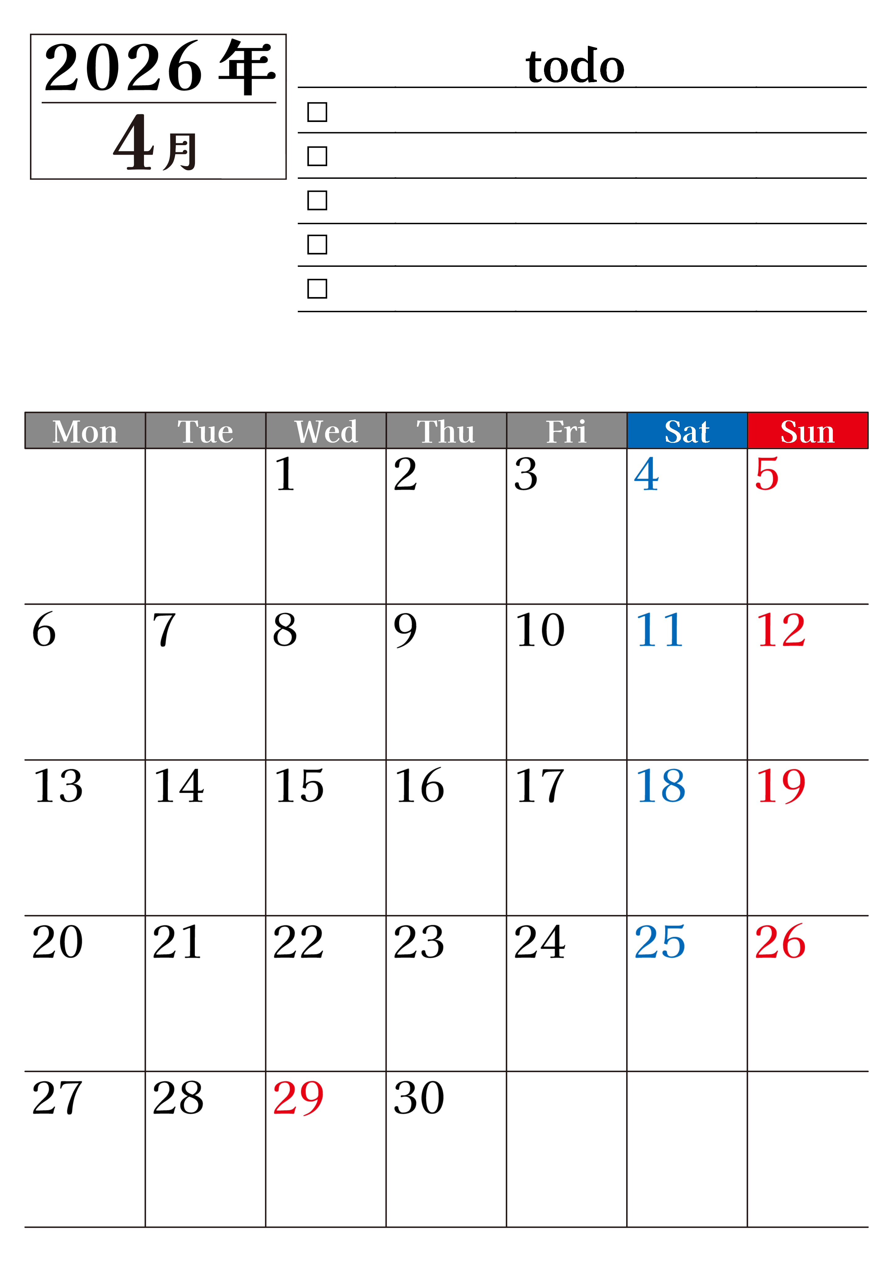 2026年4月カレンダーは縦型月曜始まりのToDoリスト付き無料のフリー素材です。資格や受験勉強の計画にぴったりなので継続したいものがある人に役立つカレンダーです。無料ダウンロードはすぐにできます。(2026-01490411)