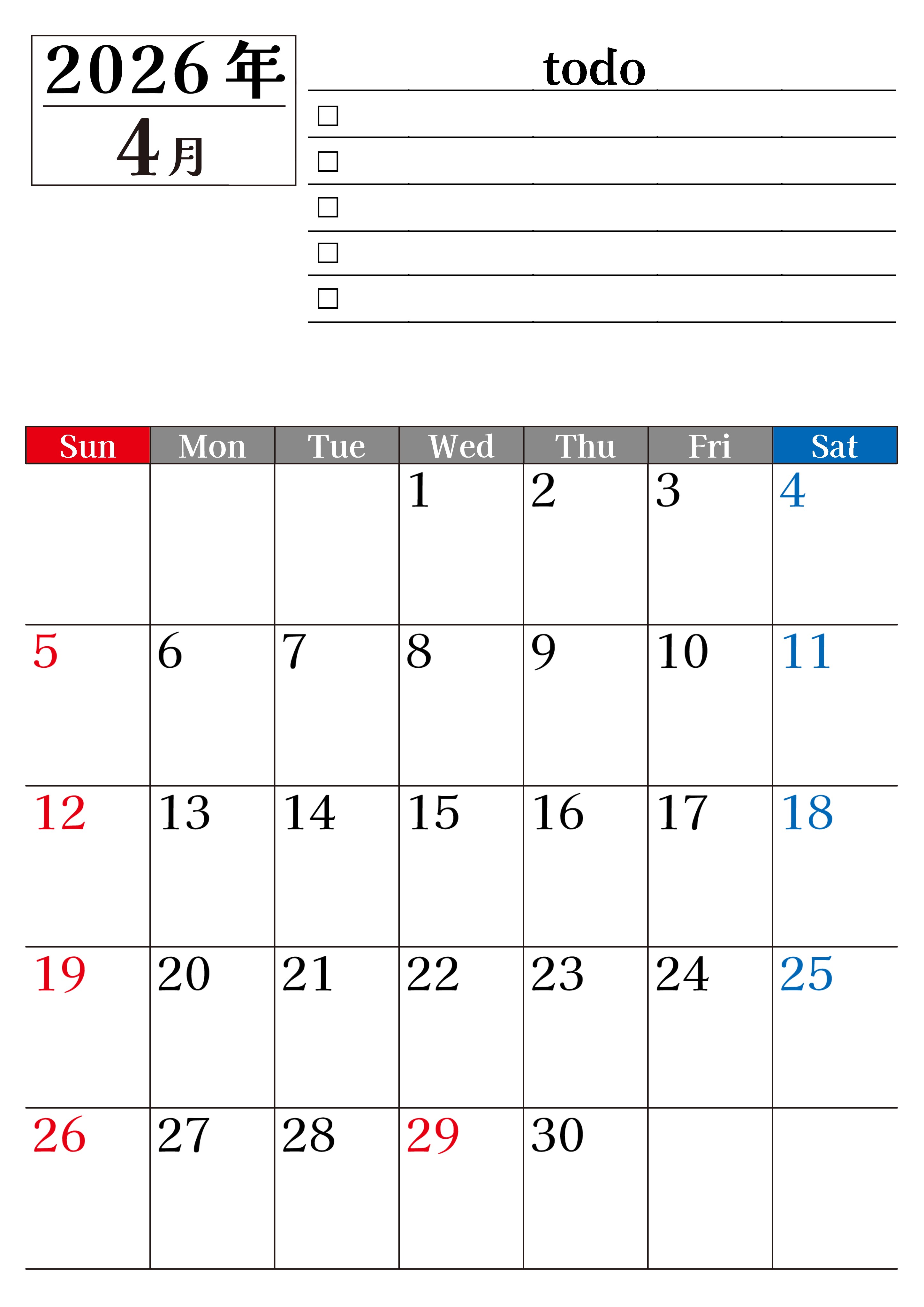 2026年4月カレンダーは縦型日曜始まりのToDoリスト付き無料のフリー素材です。資格や受験勉強の計画にぴったりなので継続したいものがある人に役立つカレンダーです。無料ダウンロードはすぐにできます。(2026-01490410)