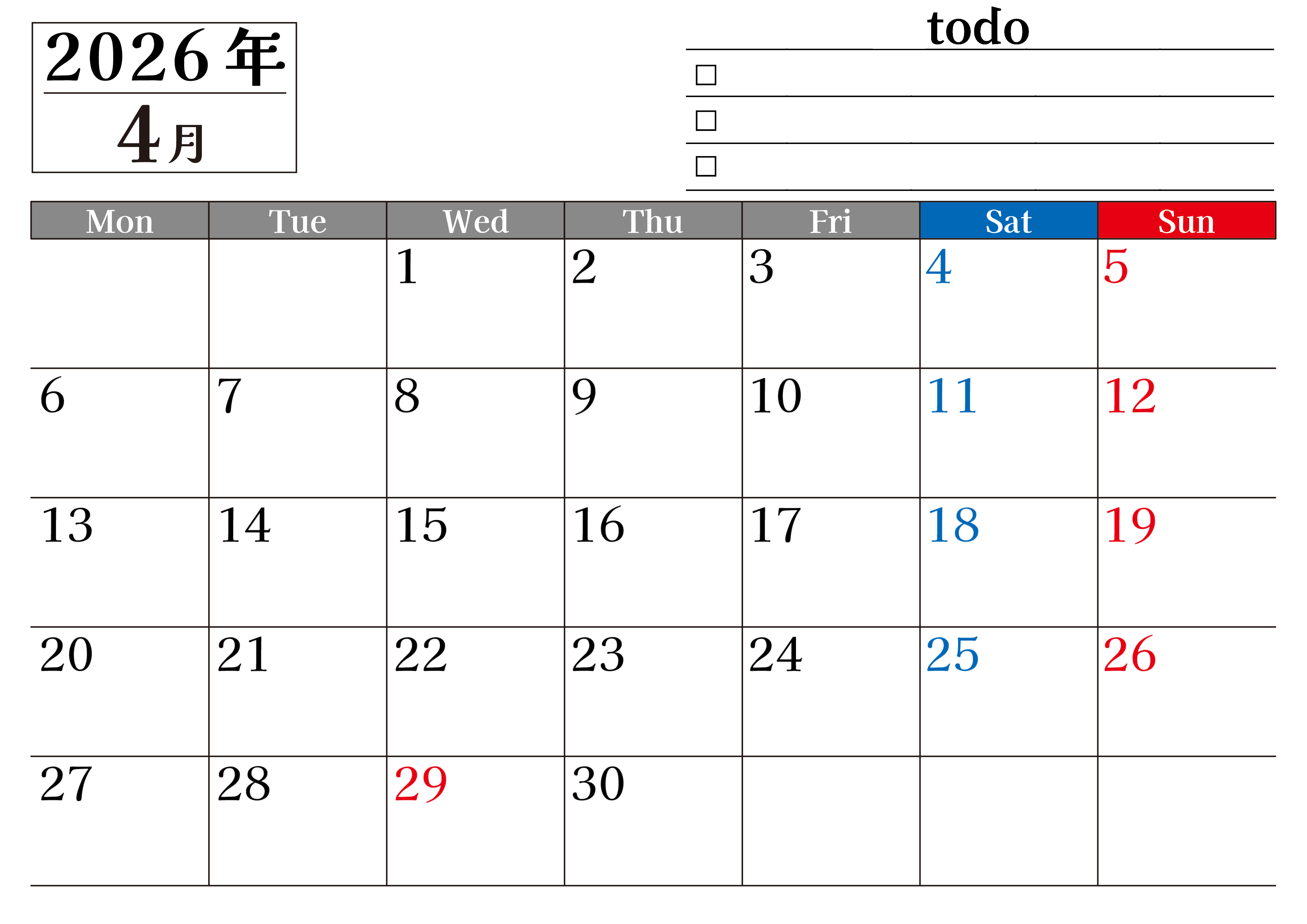 2026年4月カレンダーは横型月曜始まりのToDoリスト付き無料のフリー素材です。資格や受験勉強の計画にぴったりなので継続したいものがある人に役立つカレンダーです。無料ダウンロードはすぐにできます。(2026-01490401)