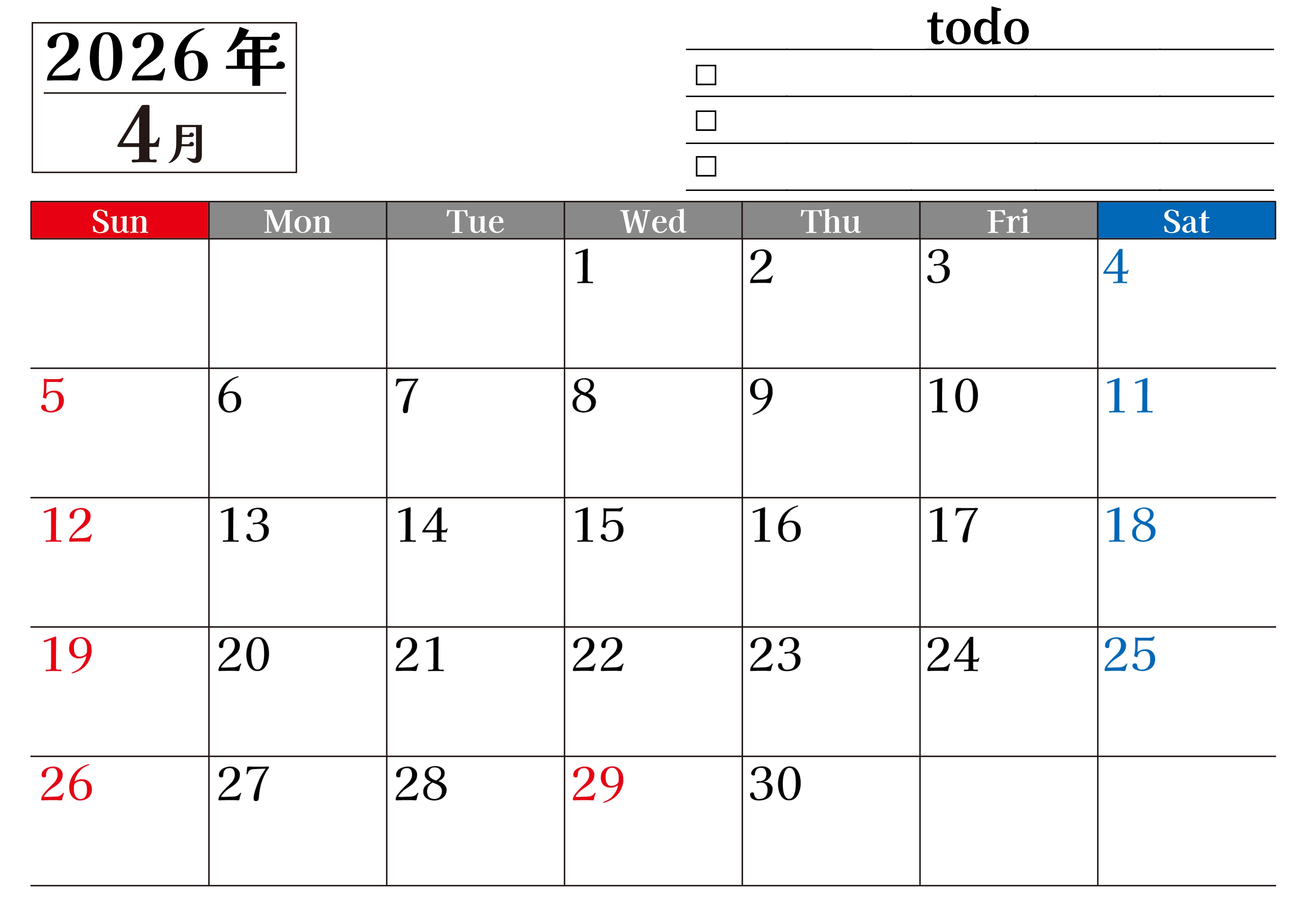 2026年4月カレンダーは横型日曜始まりのToDoリスト付き無料のフリー素材です。資格や受験勉強の計画にぴったりなので継続したいものがある人に役立つカレンダーです。無料ダウンロードはすぐにできます。(2026-01490400)