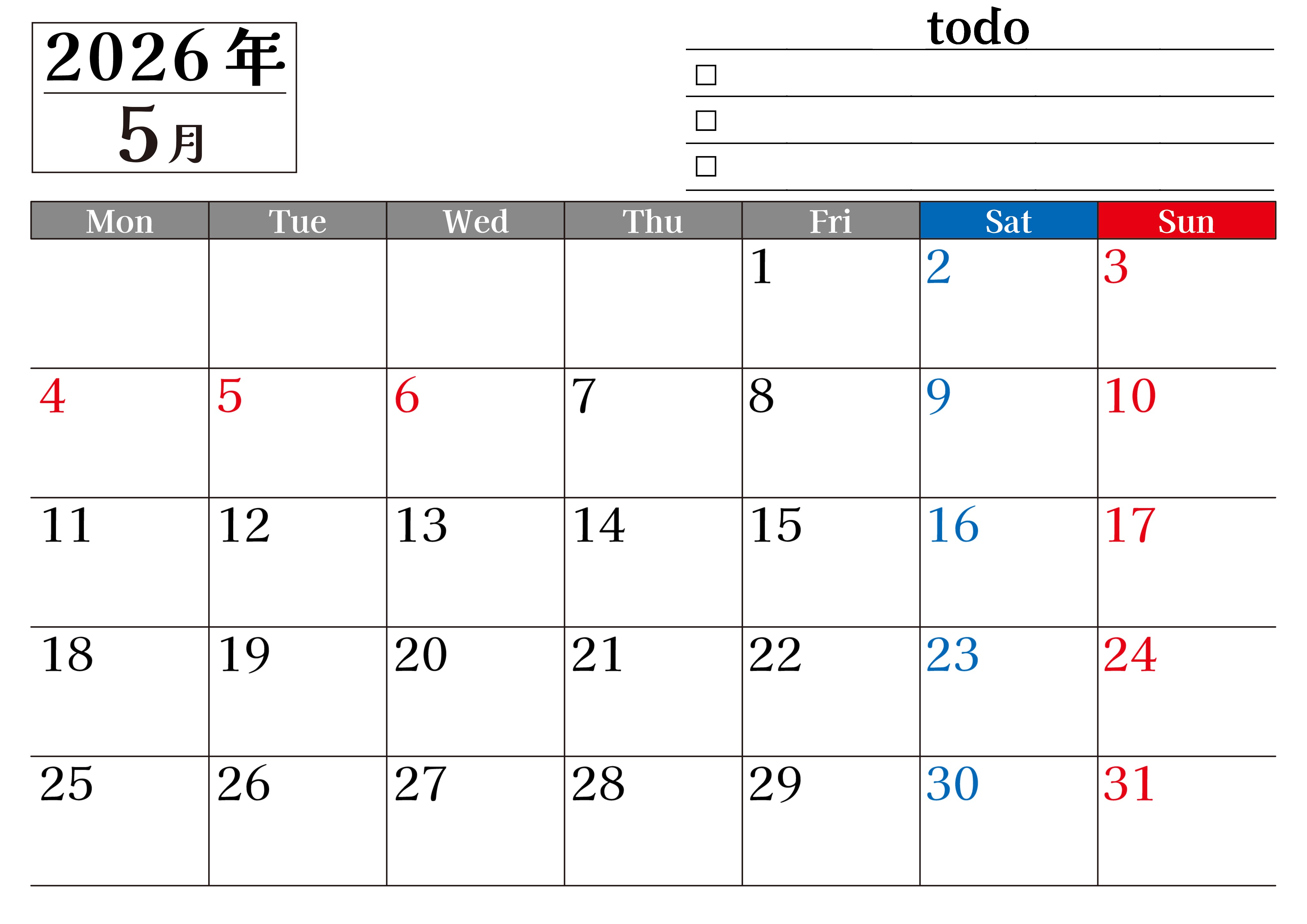 2026年5月カレンダーは横型月曜始まりのToDoリスト付き無料のフリー素材です。資格や受験勉強の計画にぴったりなので継続したいものがある人に役立つカレンダーです。無料ダウンロードはすぐにできます。(2026-01490501)