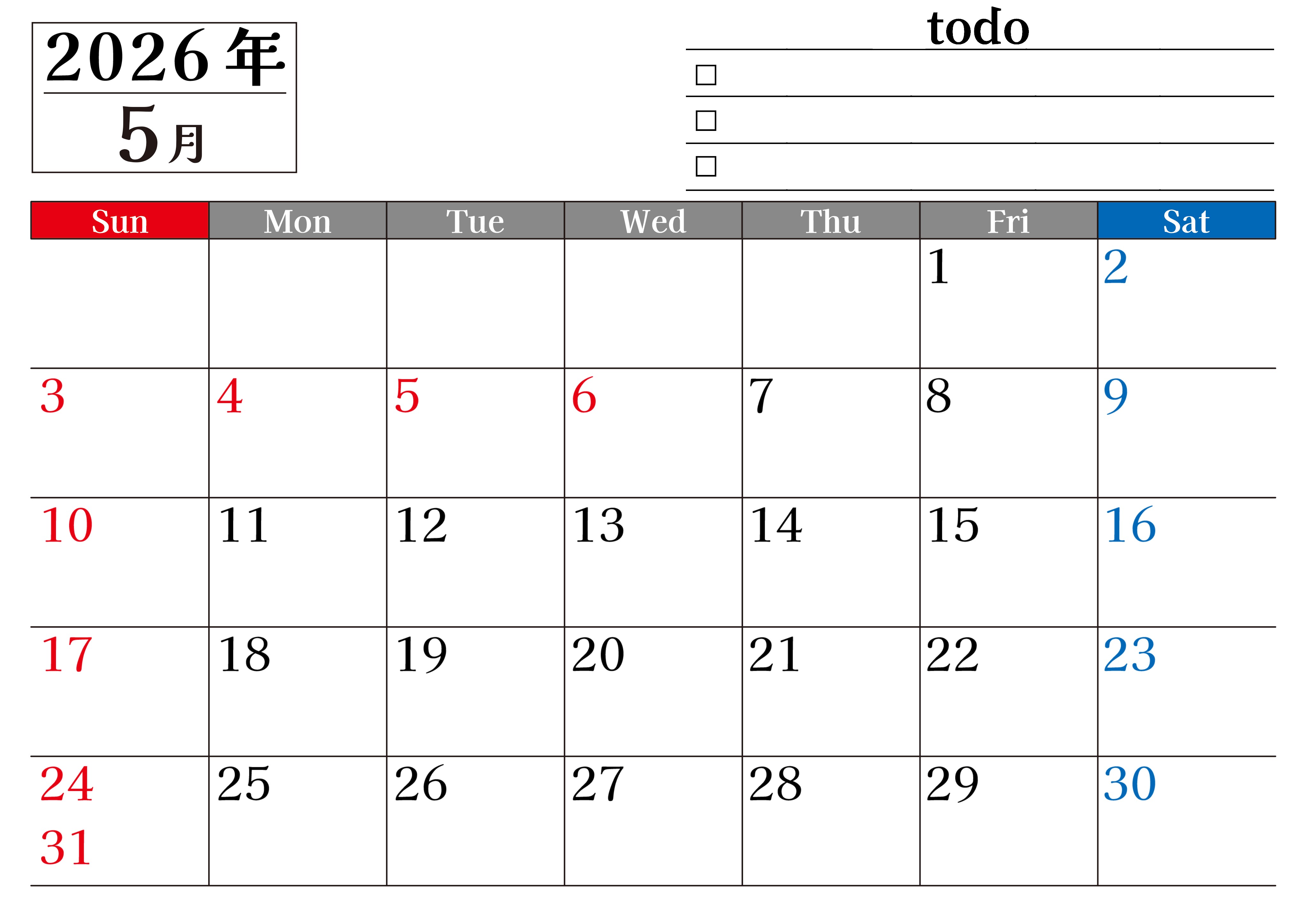 2026年5月カレンダーは横型日曜始まりのToDoリスト付き無料のフリー素材です。資格や受験勉強の計画にぴったりなので継続したいものがある人に役立つカレンダーです。無料ダウンロードはすぐにできます。(2026-01490500)