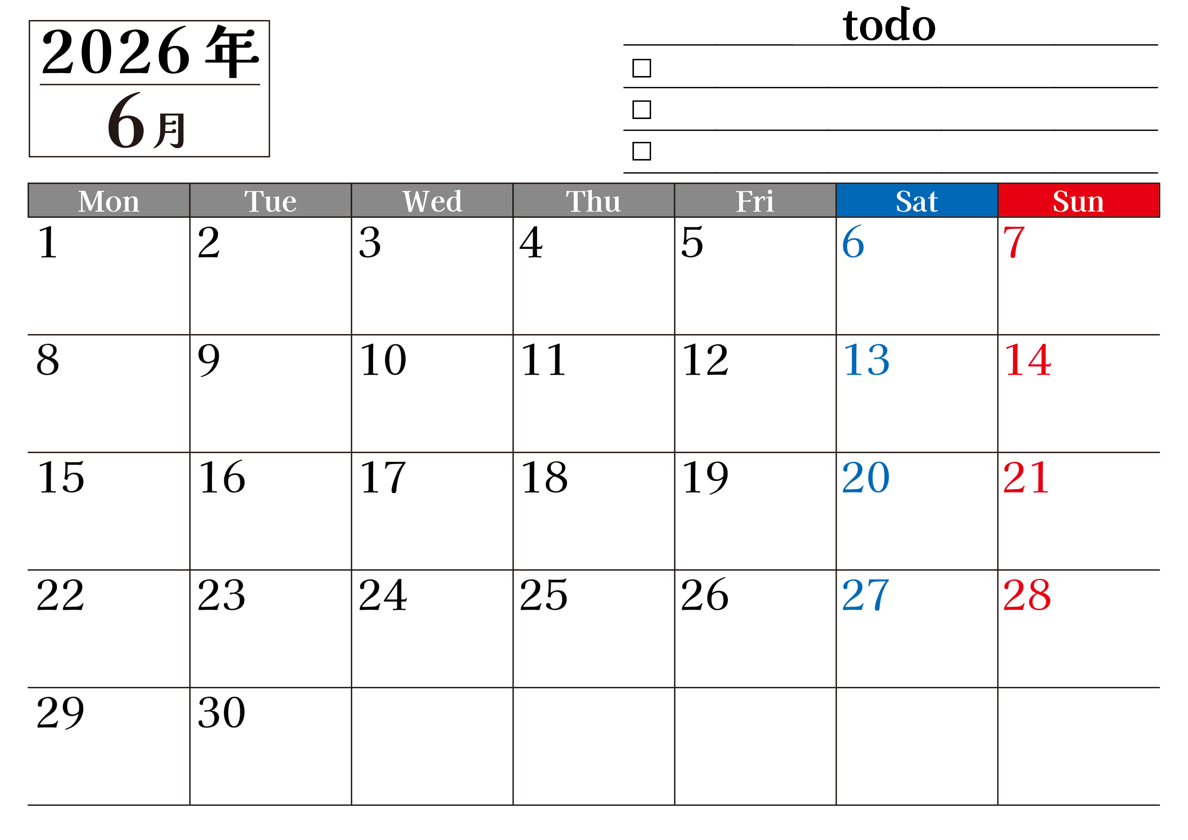 2026年6月カレンダーは横型月曜始まりのToDoリスト付き無料のフリー素材です。資格や受験勉強の計画にぴったりなので継続したいものがある人に役立つカレンダーです。無料ダウンロードはすぐにできます。(2026-01490601)