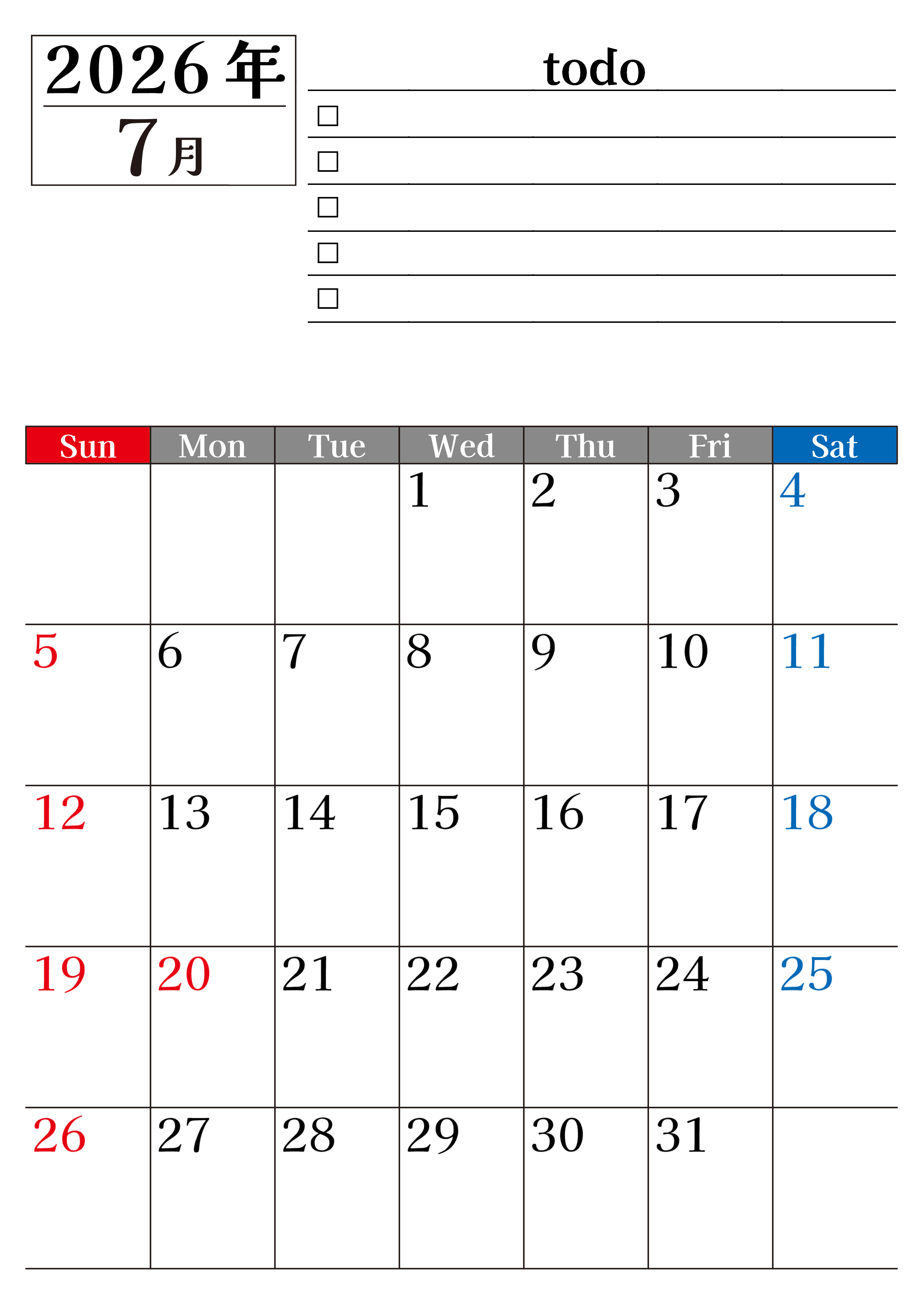 2026年7月カレンダーは縦型日曜始まりのToDoリスト付き無料のフリー素材です。資格や受験勉強の計画にぴったりなので継続したいものがある人に役立つカレンダーです。無料ダウンロードはすぐにできます。(2026-01490710)
