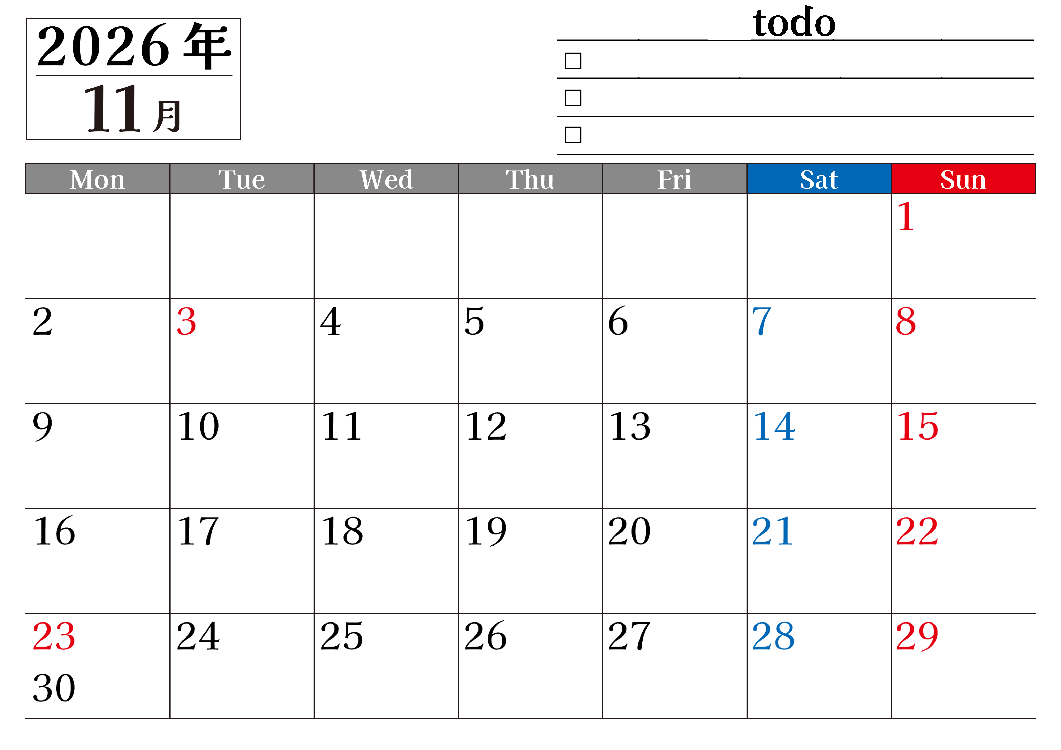2026年11月カレンダーは横型月曜始まりのToDoリスト付き無料のフリー素材です。資格や受験勉強の計画にぴったりなので継続したいものがある人に役立つカレンダーです。無料ダウンロードはすぐにできます。(2026-01491101)