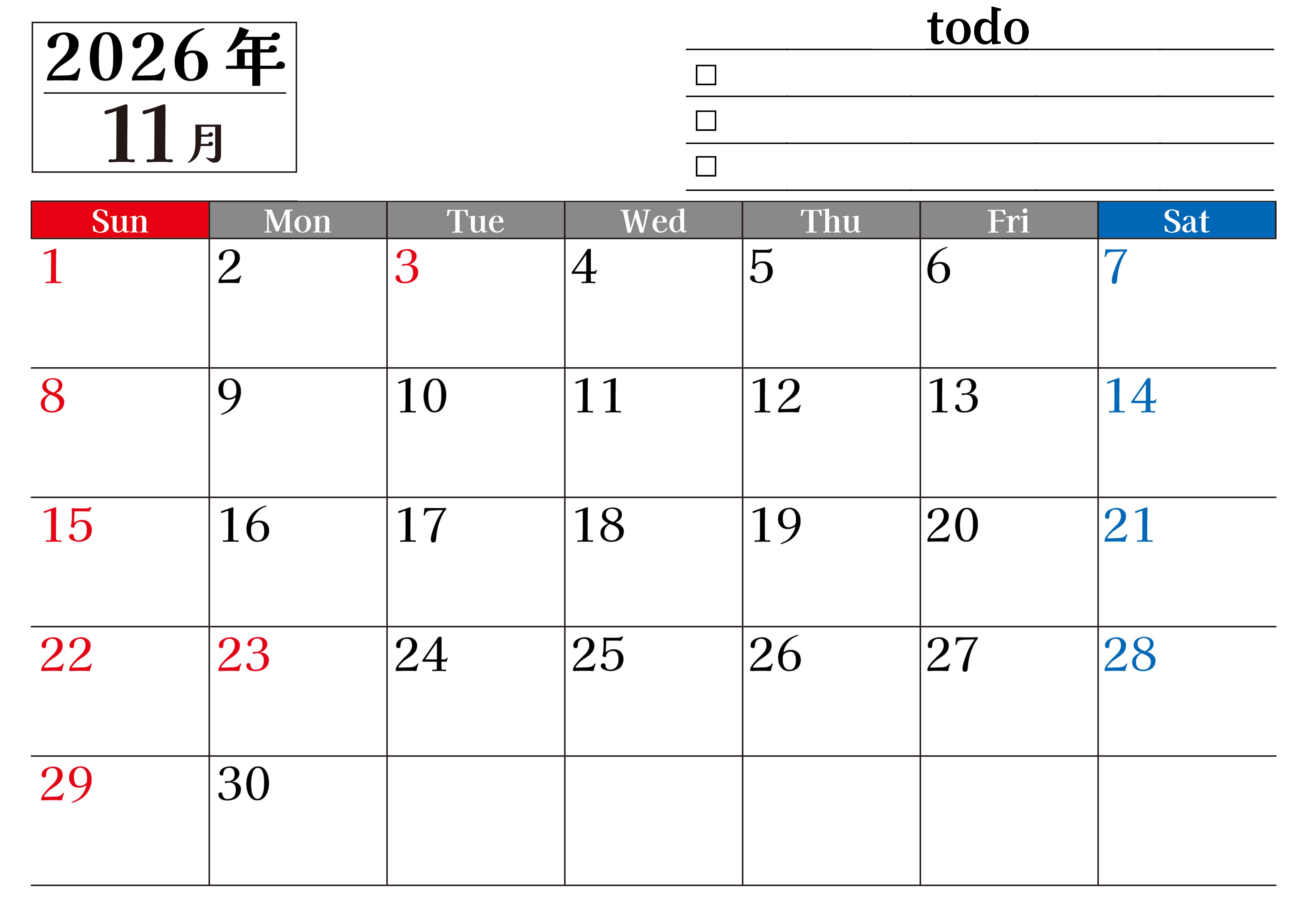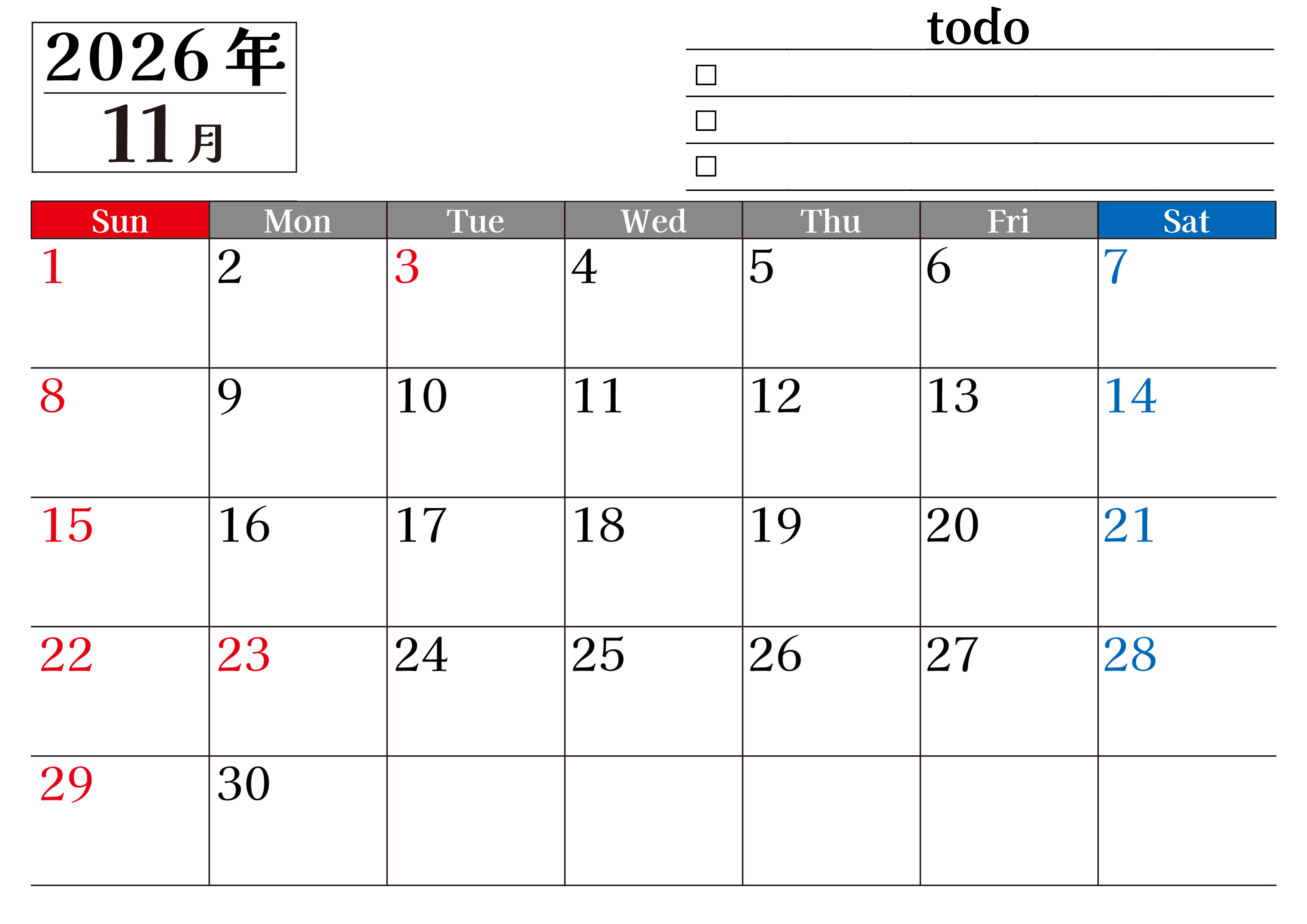 2026年11月カレンダーは横型日曜始まりのToDoリスト付き無料のフリー素材です。資格や受験勉強の計画にぴったりなので継続したいものがある人に役立つカレンダーです。無料ダウンロードはすぐにできます。(2026-01491100)