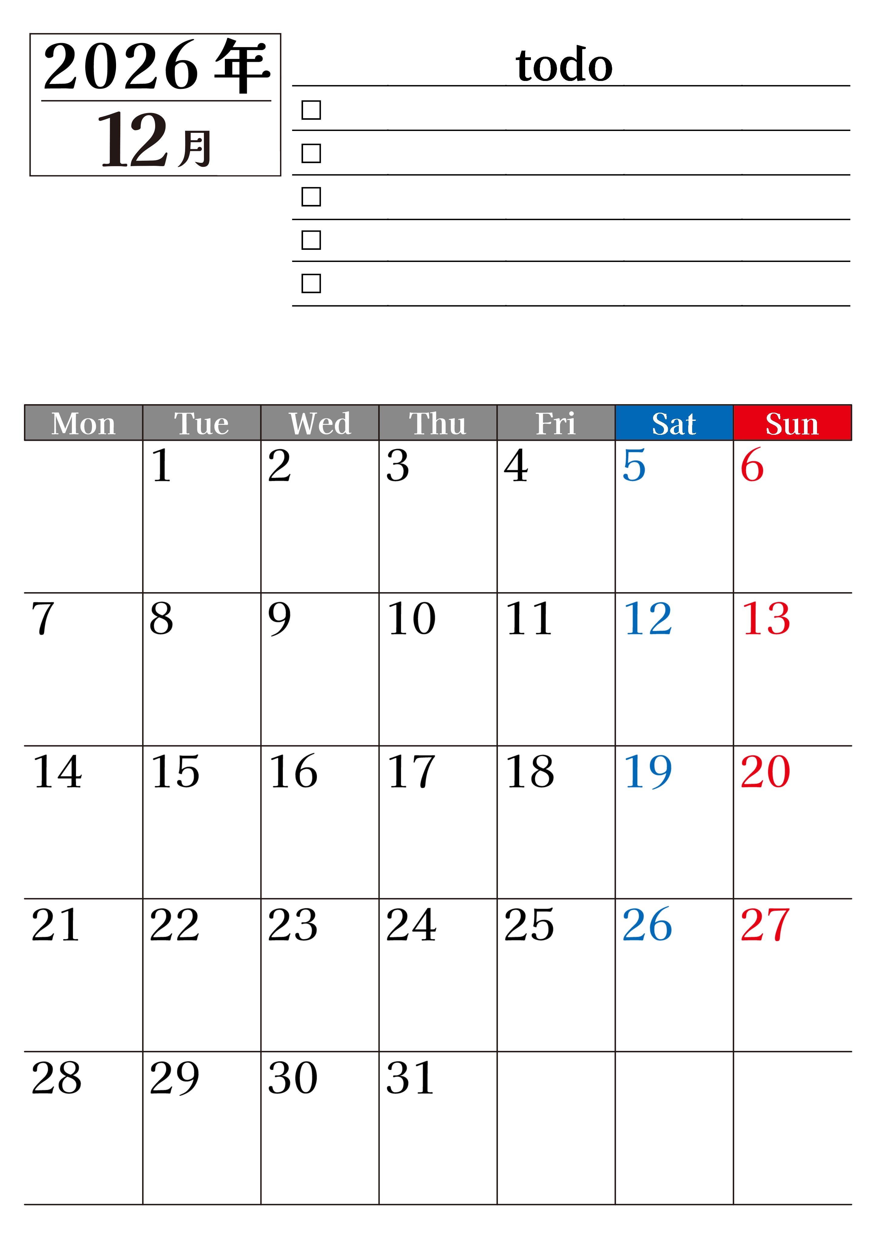 2026年12月カレンダーは縦型月曜始まりのToDoリスト付き無料のフリー素材です。資格や受験勉強の計画にぴったりなので継続したいものがある人に役立つカレンダーです。無料ダウンロードはすぐにできます。(2026-01491211)