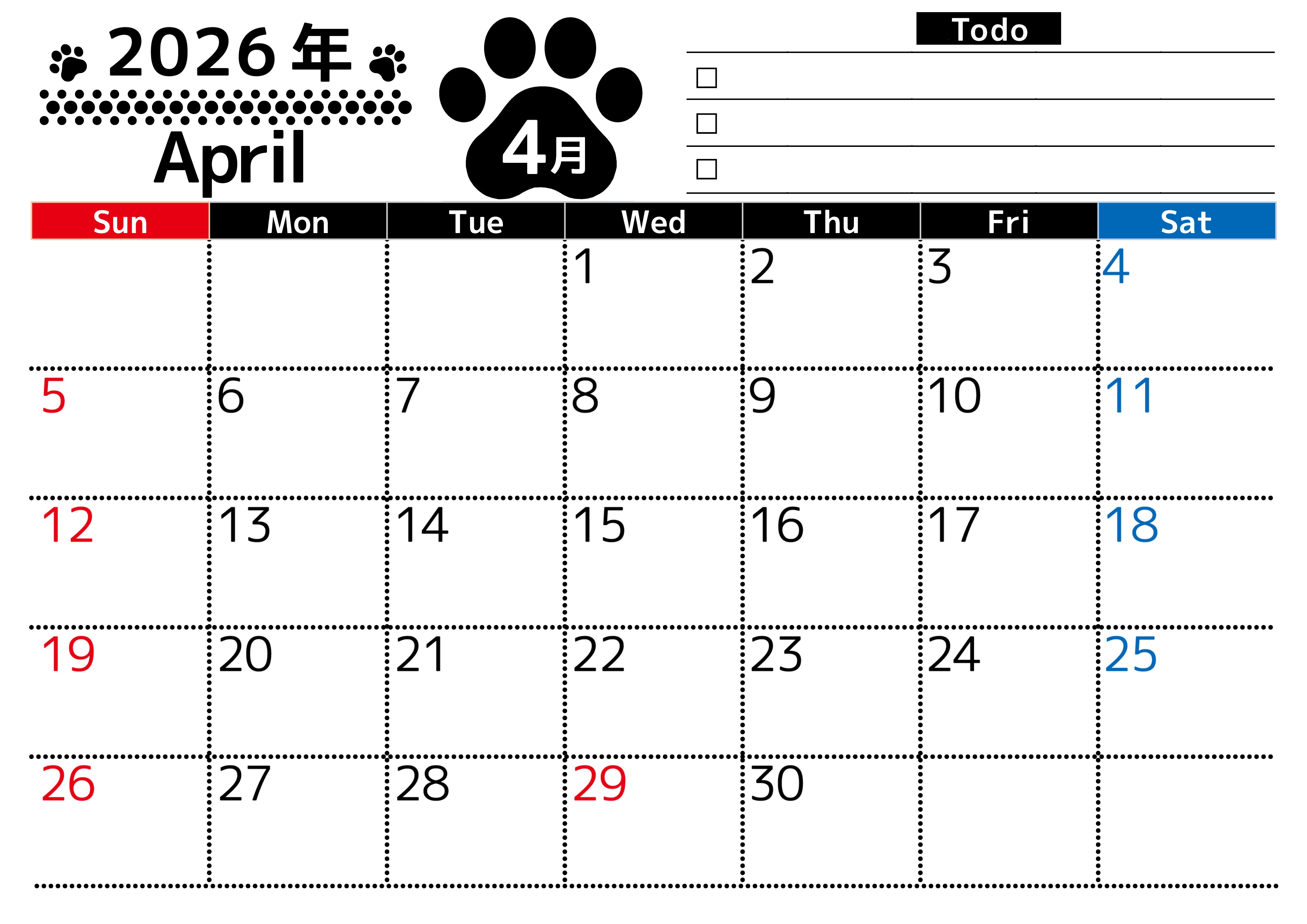 2026年・無料のカレンダーテンプレート 2026年4月カレンダーは横型日曜始まりのToDoリスト付無料素材♪資格や受験勉強の計画におすすめ♪(2026-01500400) 素材状デザイン王 2025年4月12日 2026年4月カレンダーは横型日曜始まりのToDoリスト付き無料のフリー素材です。資格や受験勉強の計画におすすめなので自己啓発をしたい方におすすめです。無料ダウンロードすればすぐに印刷ができます。(2026-01500400) 4月 横型のカレンダー 日曜始まり ToDoリスト カレンダーデザイン-0150