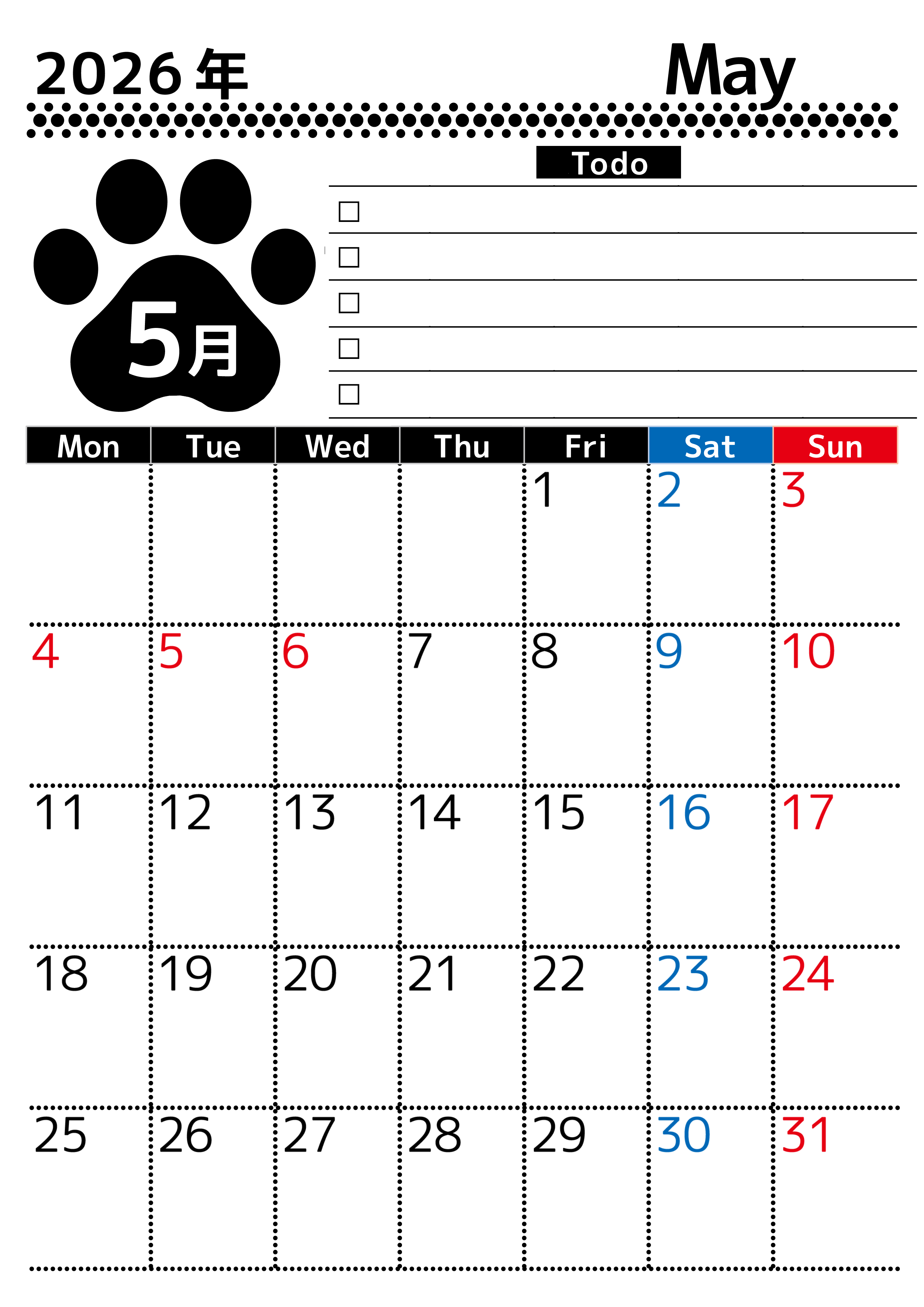 2026年・無料のカレンダーテンプレート 2026年5月カレンダーは縦型月曜始まりのToDoリスト付無料素材♪資格や受験勉強の計画におすすめ♪(2026-01500511) 素材状デザイン王 2025年4月12日 2026年5月カレンダーは縦型月曜始まりのToDoリスト付き無料のフリー素材です。資格や受験勉強の計画におすすめなので自己啓発をしたい方におすすめです。無料ダウンロードすればすぐに印刷ができます。(2026-01500511) 5月 縦型のカレンダー 月曜始まり ToDoリスト カレンダーデザイン-0150
