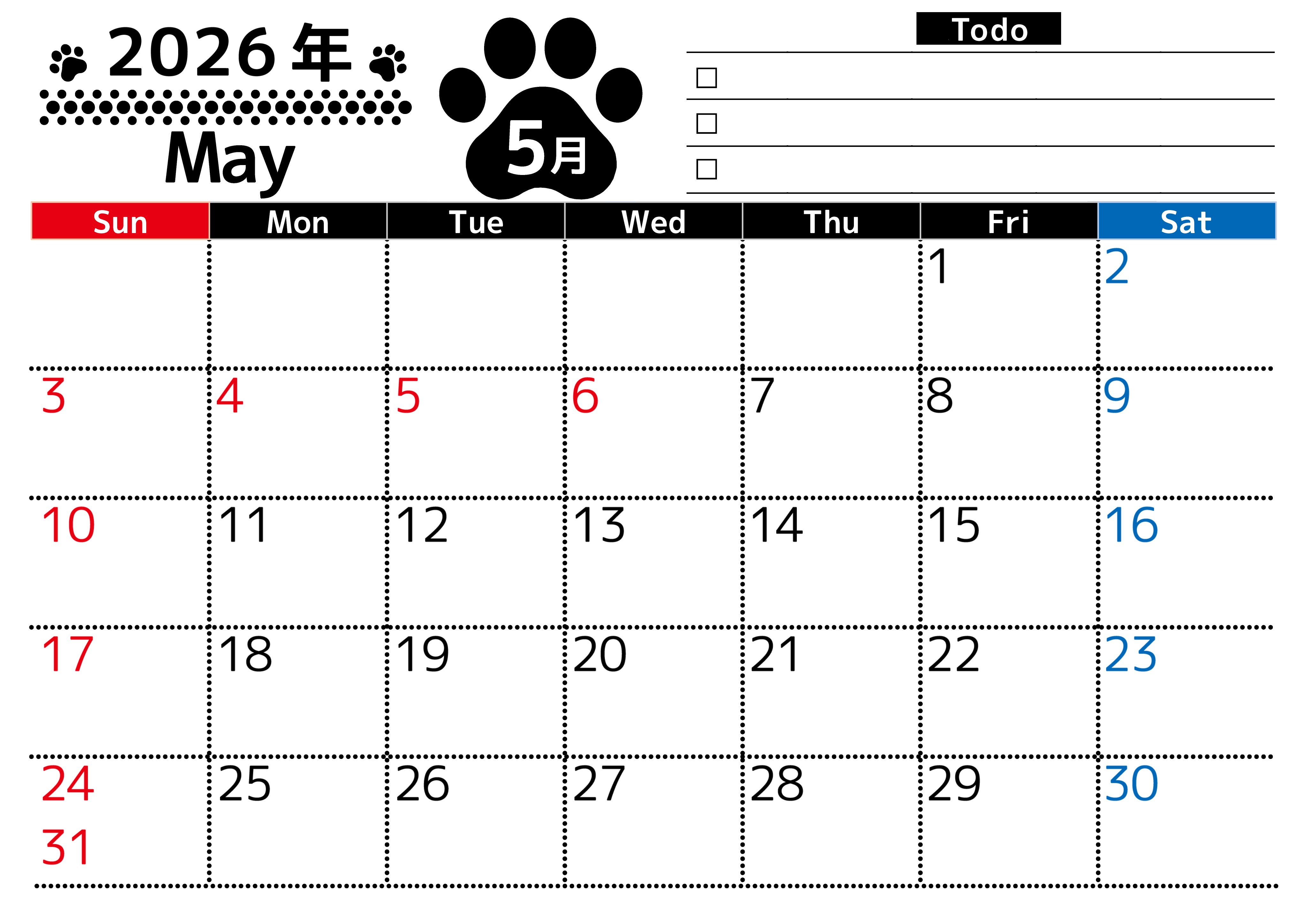 2026年・無料のカレンダーテンプレート 2026年5月カレンダーは横型日曜始まりのToDoリスト付無料素材♪資格や受験勉強の計画におすすめ♪(2026-01500500) 素材状デザイン王 2025年4月12日 2026年5月カレンダーは横型日曜始まりのToDoリスト付き無料のフリー素材です。資格や受験勉強の計画におすすめなので自己啓発をしたい方におすすめです。無料ダウンロードすればすぐに印刷ができます。(2026-01500500) 5月 横型のカレンダー 日曜始まり ToDoリスト カレンダーデザイン-0150