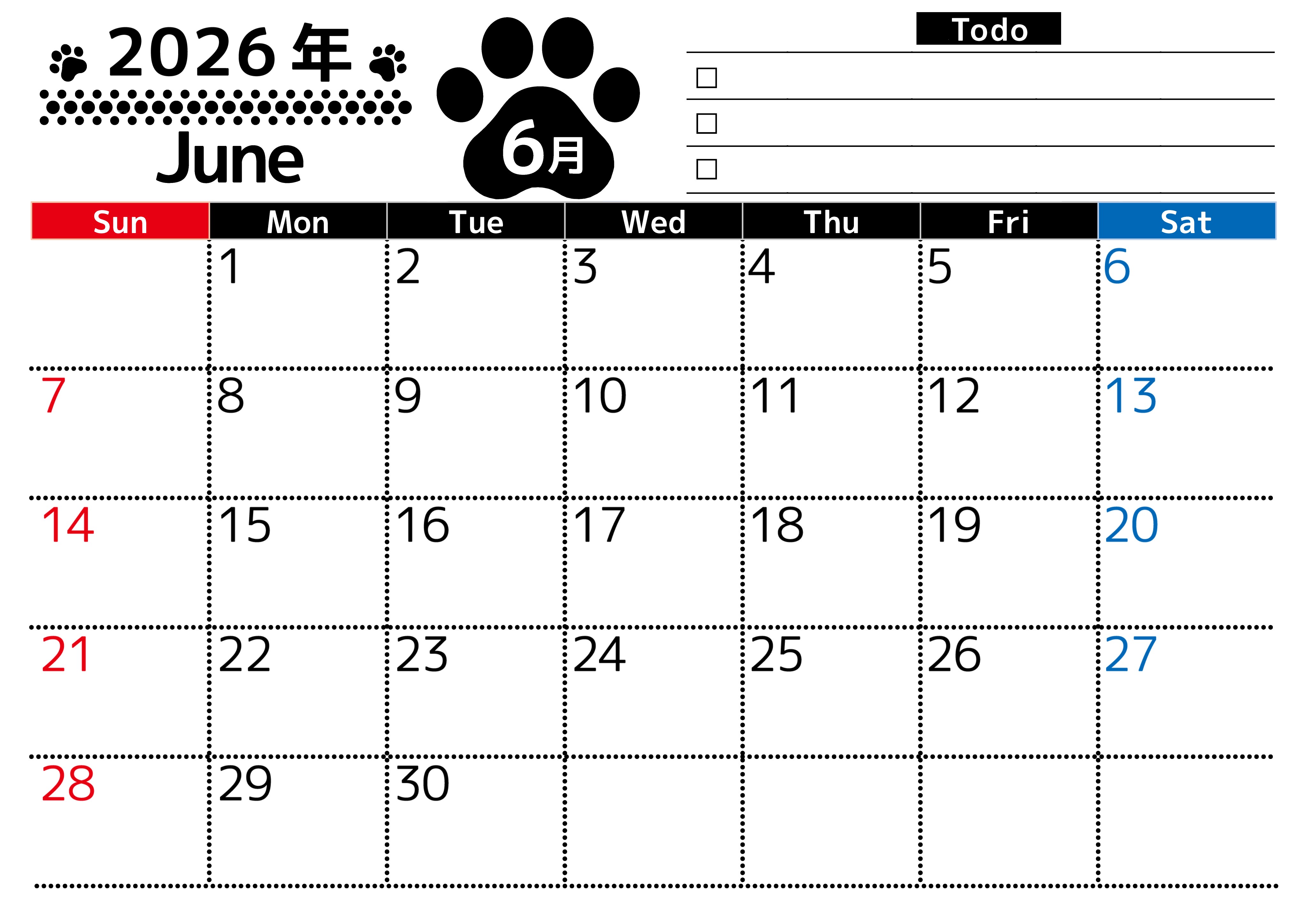 2026年・無料のカレンダーテンプレート 2026年6月カレンダーは横型日曜始まりのToDoリスト付無料素材♪資格や受験勉強の計画におすすめ♪(2026-01500600) 素材状デザイン王 2025年4月12日 2026年6月カレンダーは横型日曜始まりのToDoリスト付き無料のフリー素材です。資格や受験勉強の計画におすすめなので自己啓発をしたい方におすすめです。無料ダウンロードすればすぐに印刷ができます。(2026-01500600) 6月 横型のカレンダー 日曜始まり ToDoリスト カレンダーデザイン-0150