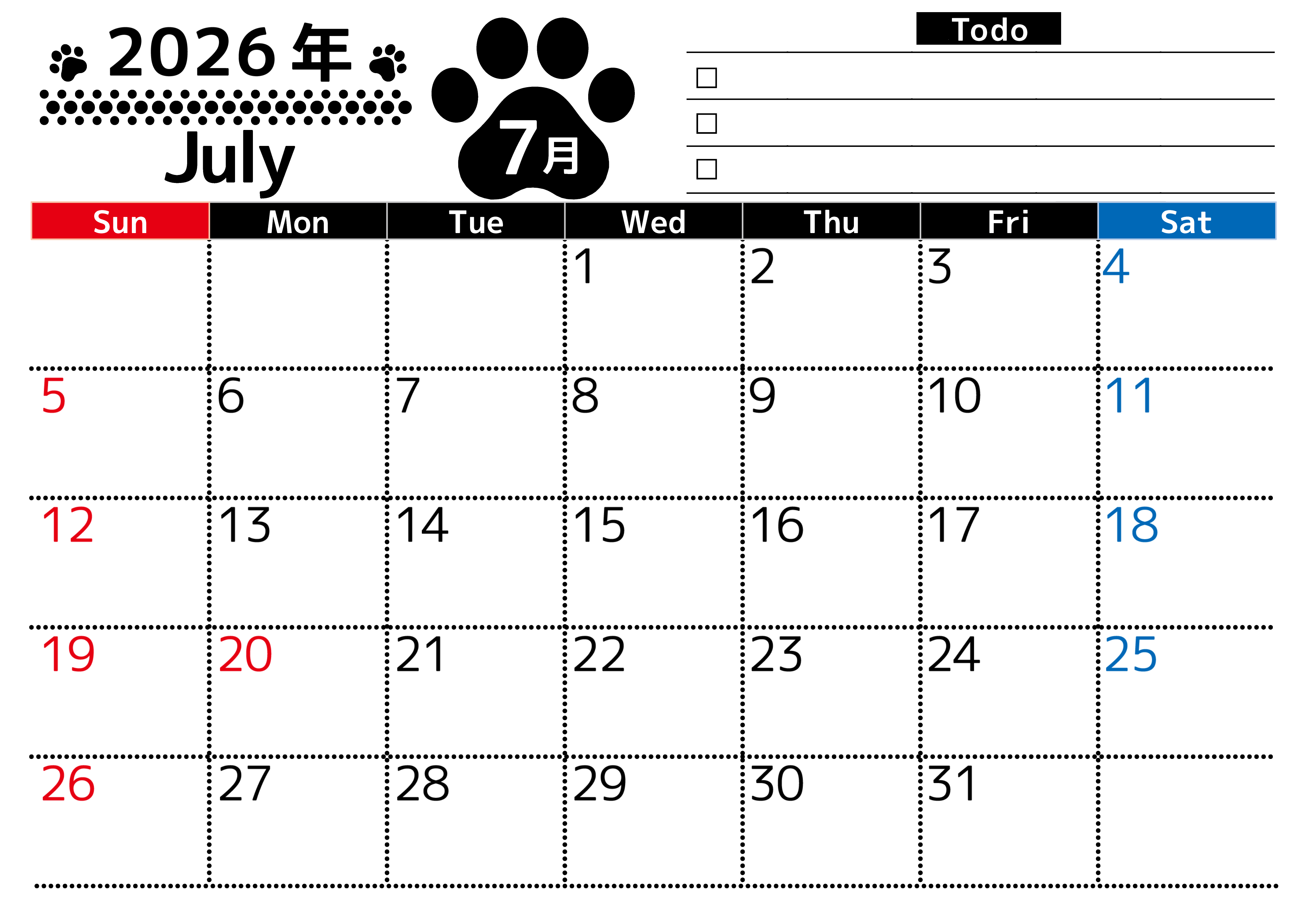 2026年7月カレンダーは横型日曜始まりのToDoリスト付き無料のフリー素材です。資格や受験勉強の計画におすすめなので自己啓発をしたい方におすすめです。無料ダウンロードすればすぐに印刷ができます。(2026-01500700)