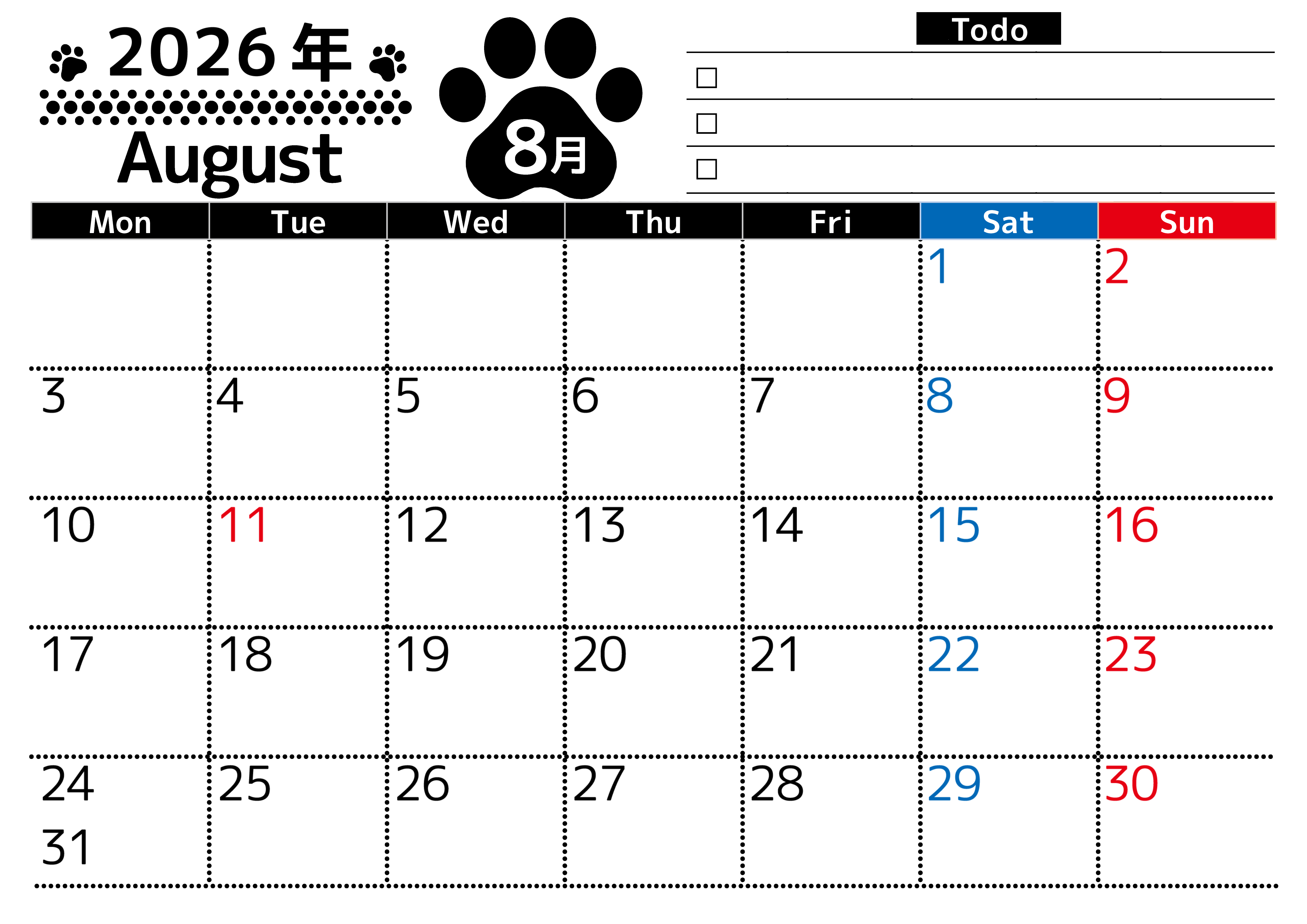 2026年・無料のカレンダーテンプレート 2026年8月カレンダーは横型月曜始まりのToDoリスト付無料素材♪資格や受験勉強の計画におすすめ♪(2026-01500801) 素材状デザイン王 2025年4月12日 2026年8月カレンダーは横型月曜始まりのToDoリスト付き無料のフリー素材です。資格や受験勉強の計画におすすめなので自己啓発をしたい方におすすめです。無料ダウンロードすればすぐに印刷ができます。(2026-01500801) 8月 横型のカレンダー 月曜始まり ToDoリスト カレンダーデザイン-0150