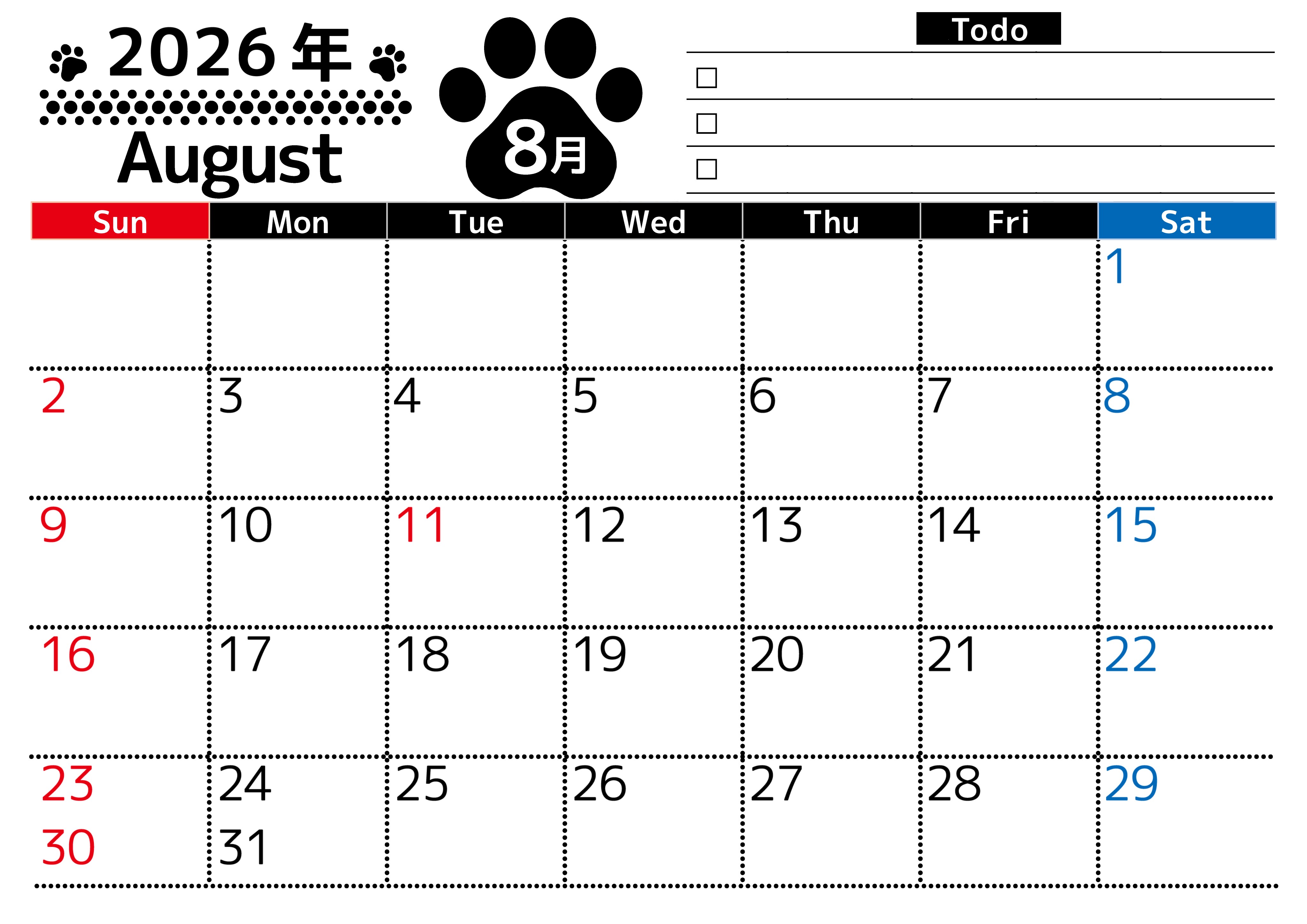 2026年・無料のカレンダーテンプレート 2026年8月カレンダーは横型日曜始まりのToDoリスト付無料素材♪資格や受験勉強の計画におすすめ♪(2026-01500800) 素材状デザイン王 2025年4月12日 2026年8月カレンダーは横型日曜始まりのToDoリスト付き無料のフリー素材です。資格や受験勉強の計画におすすめなので自己啓発をしたい方におすすめです。無料ダウンロードすればすぐに印刷ができます。(2026-01500800) 8月 横型のカレンダー 日曜始まり ToDoリスト カレンダーデザイン-0150