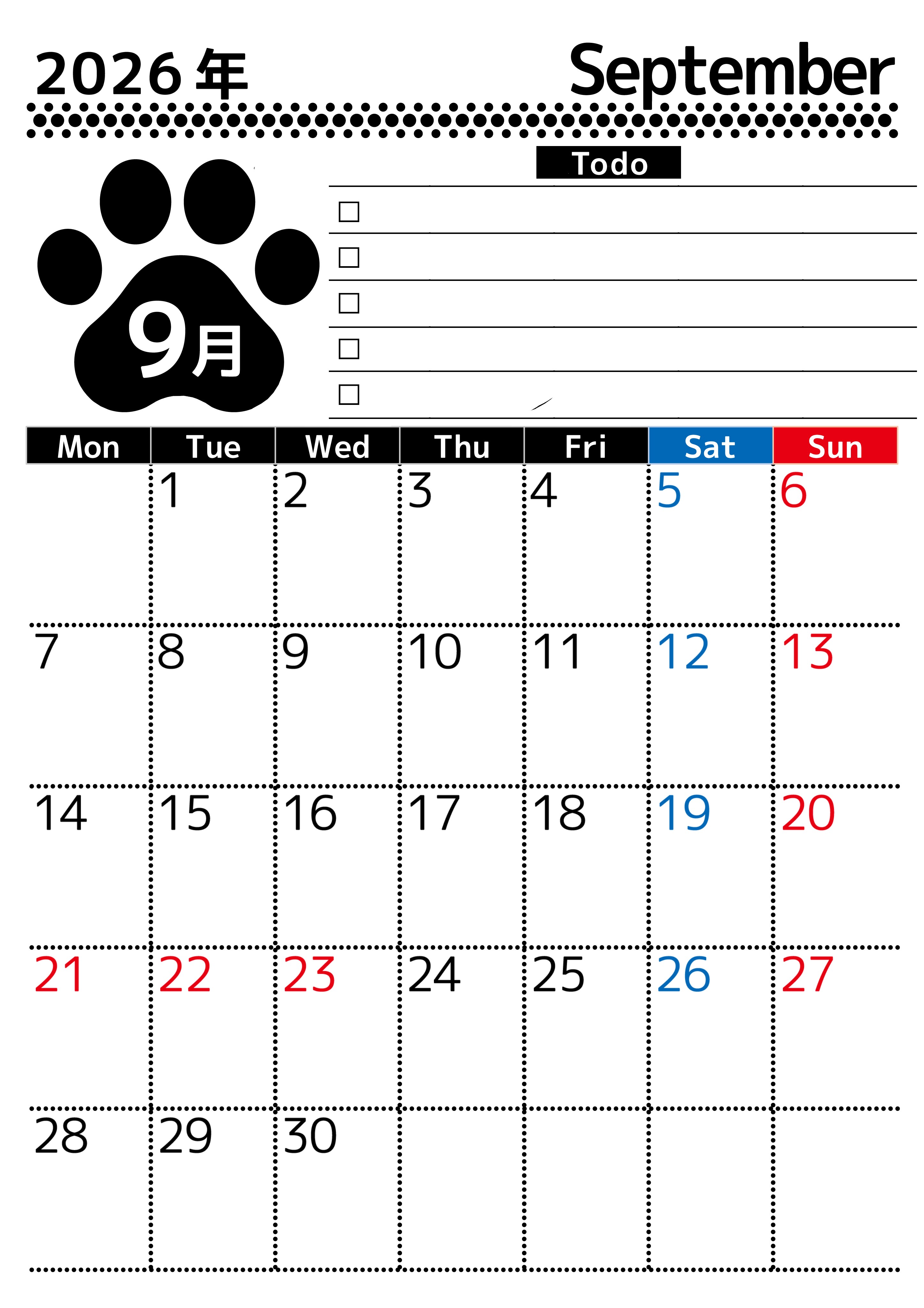 2026年・無料のカレンダーテンプレート 2026年9月カレンダーは縦型月曜始まりのToDoリスト付無料素材♪資格や受験勉強の計画におすすめ♪(2026-01500911) 素材状デザイン王 2025年4月12日 2026年9月カレンダーは縦型月曜始まりのToDoリスト付き無料のフリー素材です。資格や受験勉強の計画におすすめなので自己啓発をしたい方におすすめです。無料ダウンロードすればすぐに印刷ができます。(2026-01500911) 9月 縦型のカレンダー 月曜始まり ToDoリスト カレンダーデザイン-0150