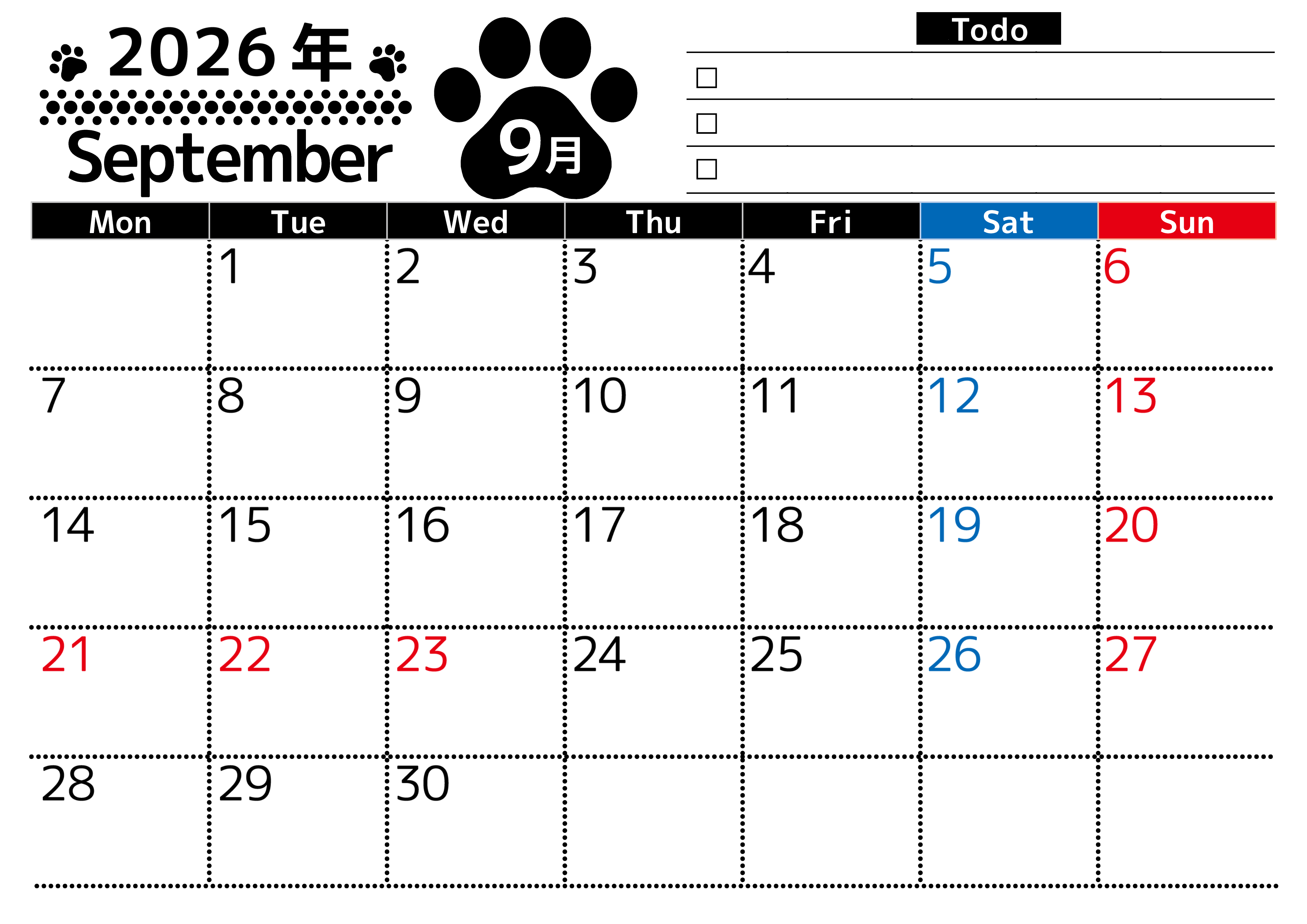 2026年・無料のカレンダーテンプレート 2026年9月カレンダーは横型月曜始まりのToDoリスト付無料素材♪資格や受験勉強の計画におすすめ♪(2026-01500901) 素材状デザイン王 2025年4月12日 2026年9月カレンダーは横型月曜始まりのToDoリスト付き無料のフリー素材です。資格や受験勉強の計画におすすめなので自己啓発をしたい方におすすめです。無料ダウンロードすればすぐに印刷ができます。(2026-01500901) 9月 横型のカレンダー 月曜始まり ToDoリスト カレンダーデザイン-0150