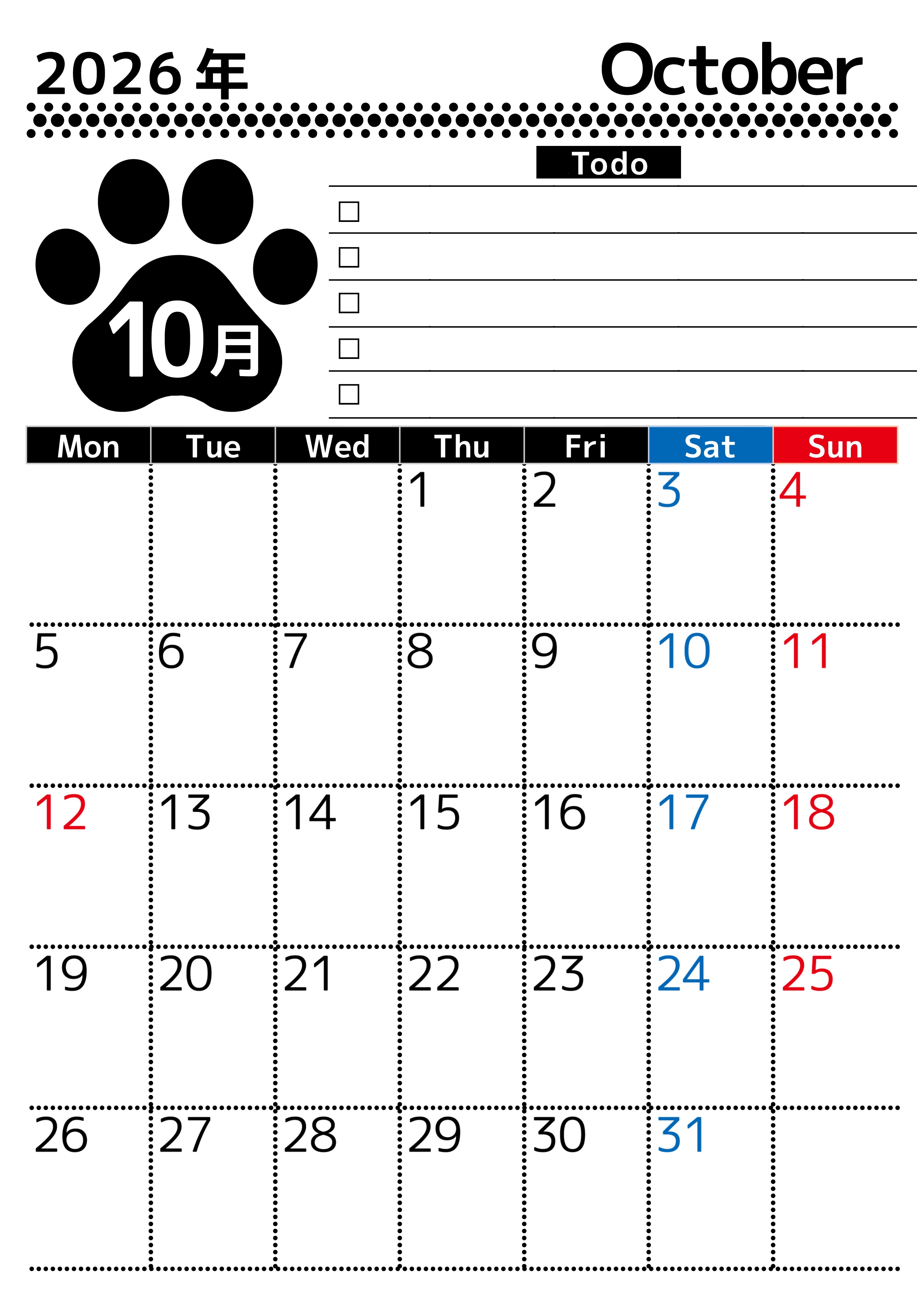 2026年10月カレンダーは縦型月曜始まりのToDoリスト付き無料のフリー素材です。資格や受験勉強の計画におすすめなので自己啓発をしたい方におすすめです。無料ダウンロードすればすぐに印刷ができます。(2026-01501011)
