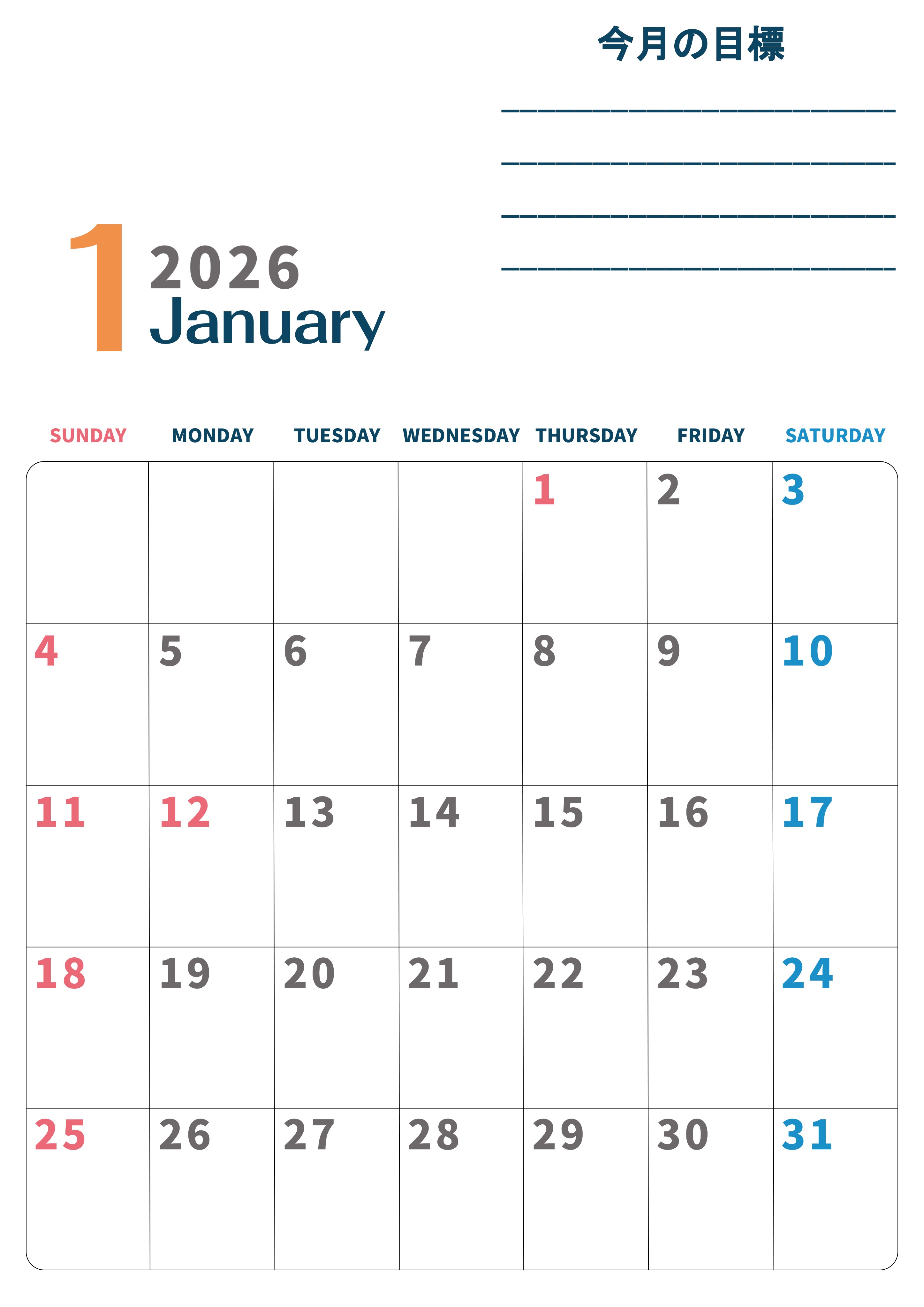 2026年・無料のカレンダーテンプレート 2026年1月カレンダーは縦型日曜始まりで目標設定もできる無料ダウンロード素材!(2026-01510110) 素材状デザイン王 2025年4月13日 2026年1月カレンダーは縦型日曜始まりで目標設定もできるので勉強や仕事のプランを立てるのに役立ちます。無料ダウンロードが簡単な素材です。(2026-01510110) 1月 縦型のカレンダー 日曜始まり 目標 カレンダーデザイン-0151