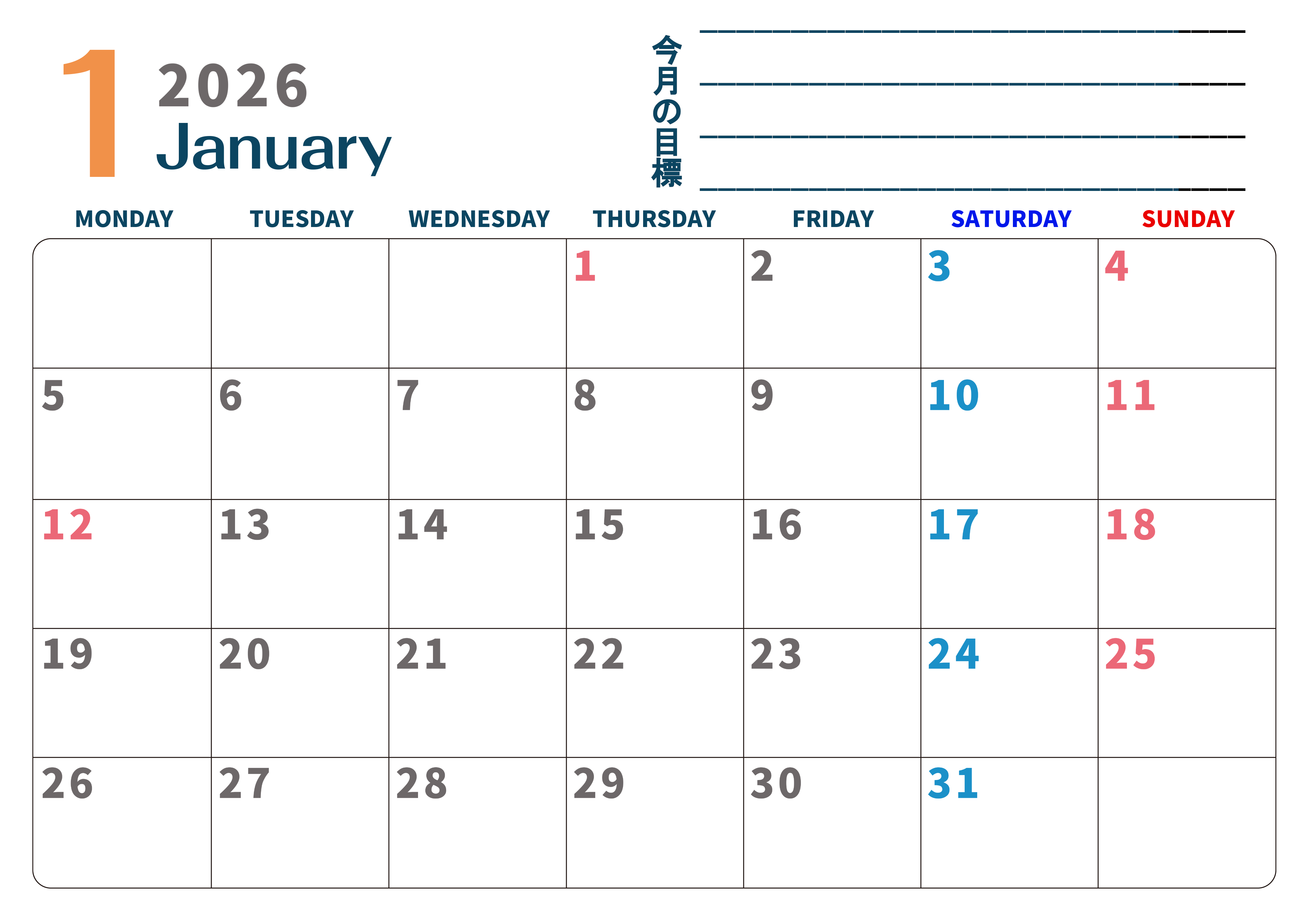 2026年・無料のカレンダーテンプレート 2026年1月カレンダーは横型月曜始まりで目標設定もできる無料ダウンロード素材!(2026-01510101) 素材状デザイン王 2025年4月13日 2026年1月カレンダーは横型月曜始まりで目標設定もできるので勉強や仕事のプランを立てるのに役立ちます。無料ダウンロードが簡単な素材です。(2026-01510101) 1月 横型のカレンダー 月曜始まり 目標 カレンダーデザイン-0151