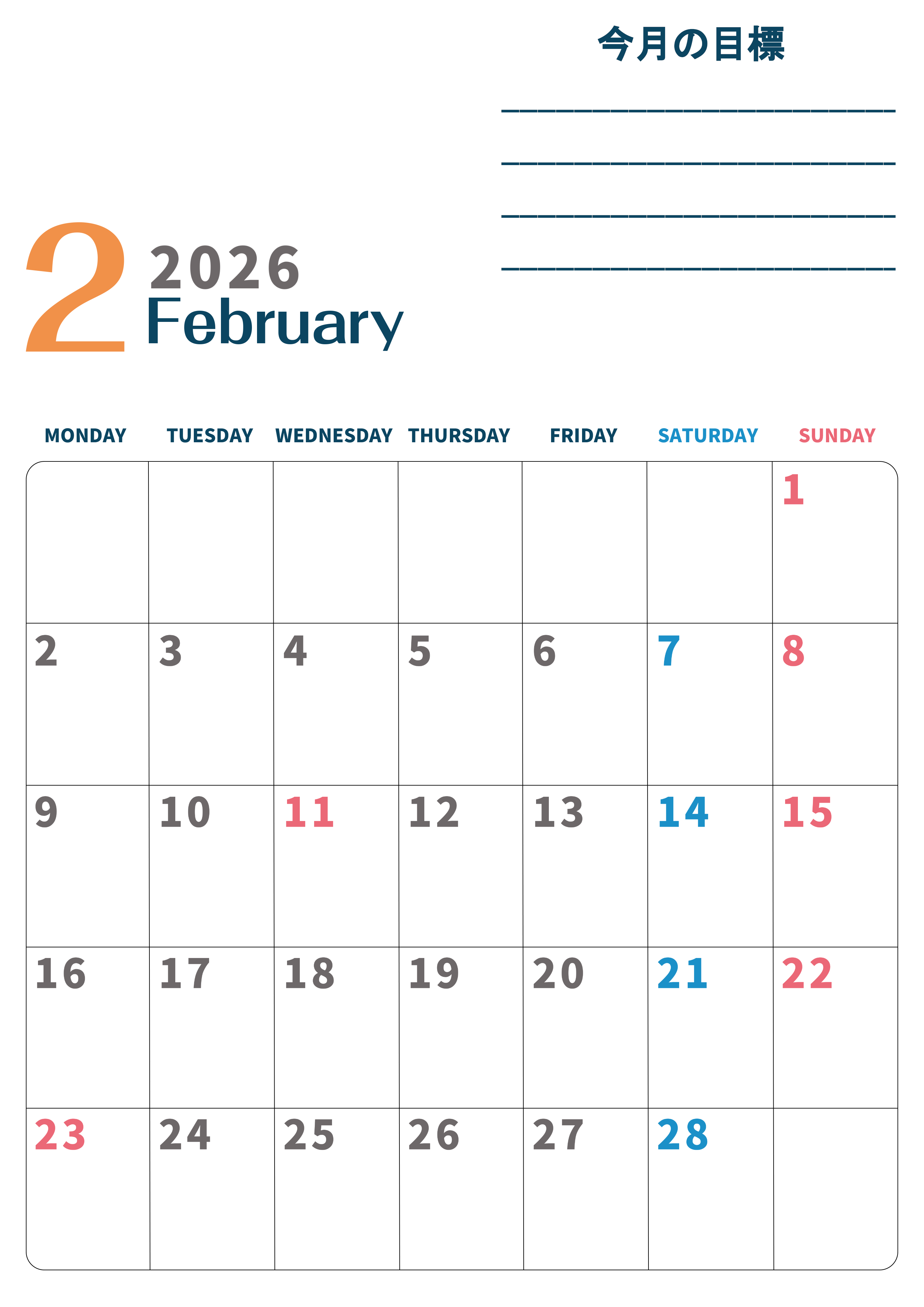 2026年・無料のカレンダーテンプレート 2026年2月カレンダーは縦型月曜始まりで目標設定もできる無料ダウンロード素材!(2026-01510211) 素材状デザイン王 2025年4月13日 2026年2月カレンダーは縦型月曜始まりで目標設定もできるので勉強や仕事のプランを立てるのに役立ちます。無料ダウンロードが簡単な素材です。(2026-01510211) 2月 縦型のカレンダー 月曜始まり 目標 カレンダーデザイン-0151