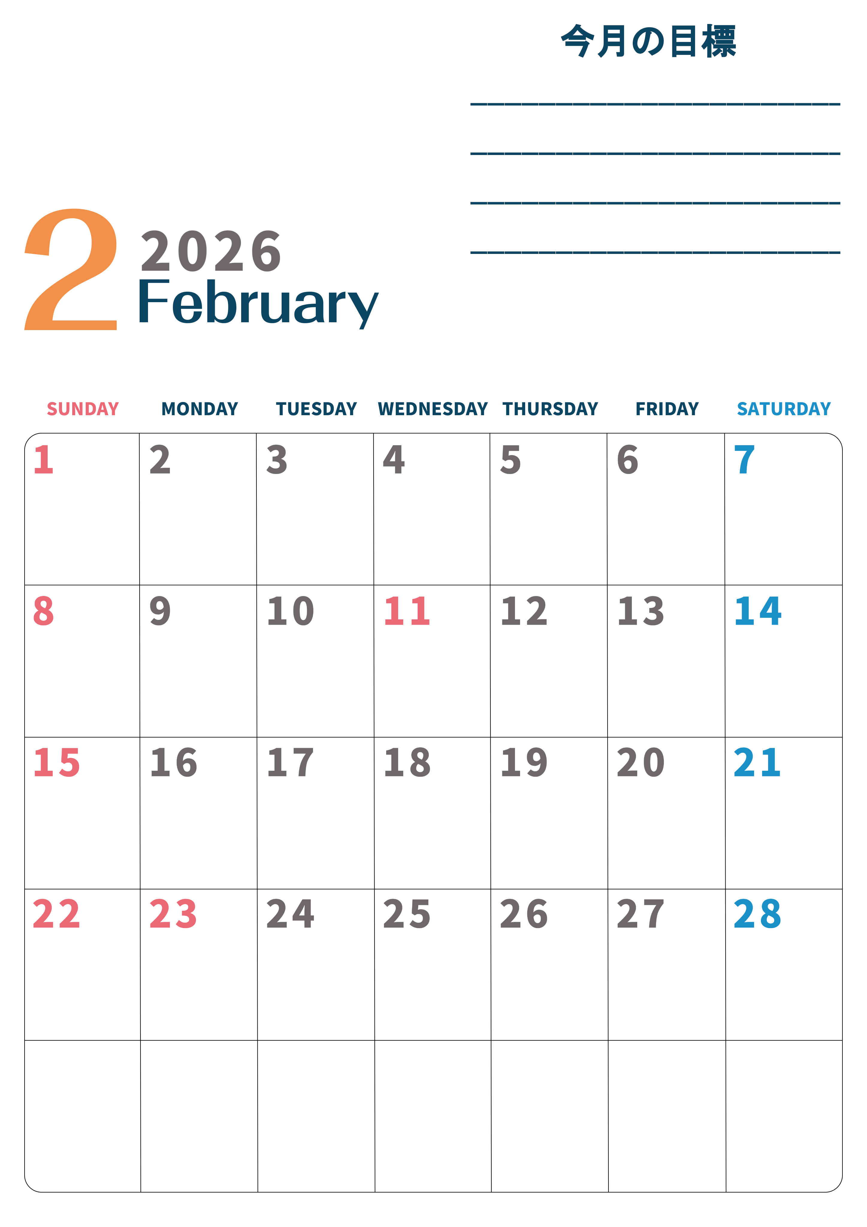 2026年2月カレンダーは縦型日曜始まりで目標設定もできるので勉強や仕事のプランを立てるのに役立ちます。無料ダウンロードが簡単な素材です。(2026-01510210)