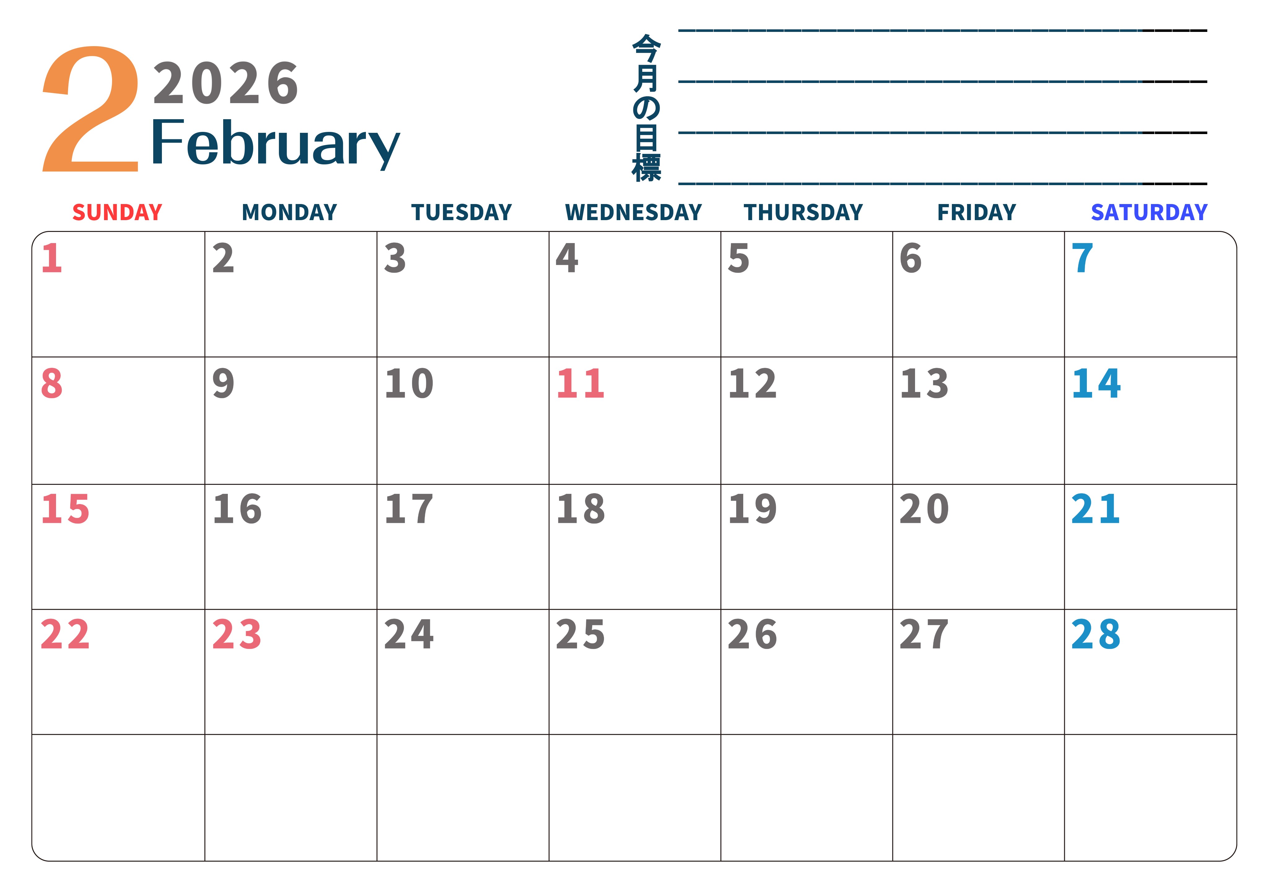 2026年・無料のカレンダーテンプレート 2026年2月カレンダーは横型日曜始まりで目標設定もできる無料ダウンロード素材!(2026-01510200) 素材状デザイン王 2025年4月13日 2026年2月カレンダーは横型日曜始まりで目標設定もできるので勉強や仕事のプランを立てるのに役立ちます。無料ダウンロードが簡単な素材です。(2026-01510200) 2月 横型のカレンダー 日曜始まり 目標 カレンダーデザイン-0151