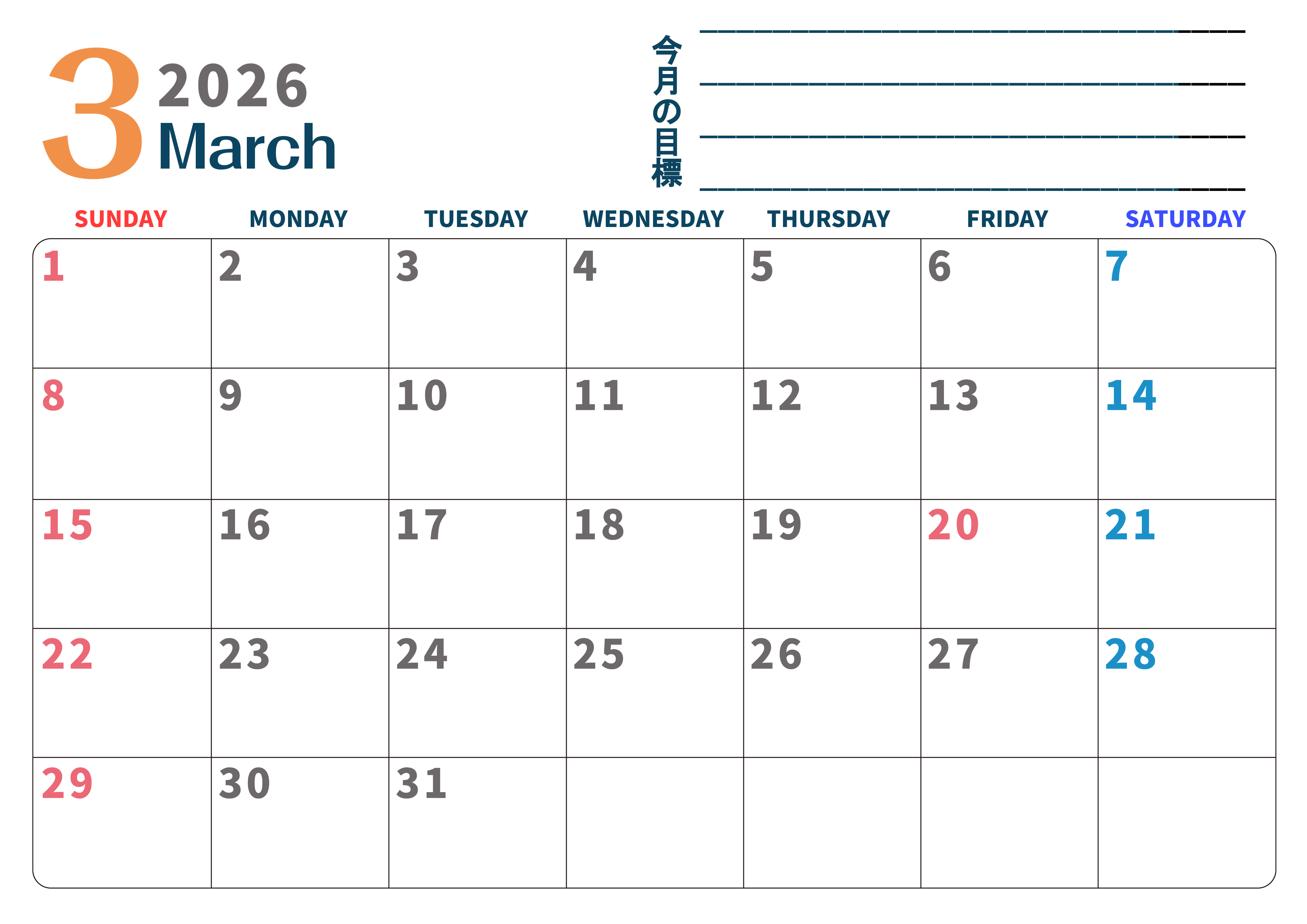 2026年・無料のカレンダーテンプレート 2026年3月カレンダーは横型日曜始まりで目標設定もできる無料ダウンロード素材!(2026-01510300) 素材状デザイン王 2025年4月13日 2026年3月カレンダーは横型日曜始まりで目標設定もできるので勉強や仕事のプランを立てるのに役立ちます。無料ダウンロードが簡単な素材です。(2026-01510300) 3月 横型のカレンダー 日曜始まり 目標 カレンダーデザイン-0151
