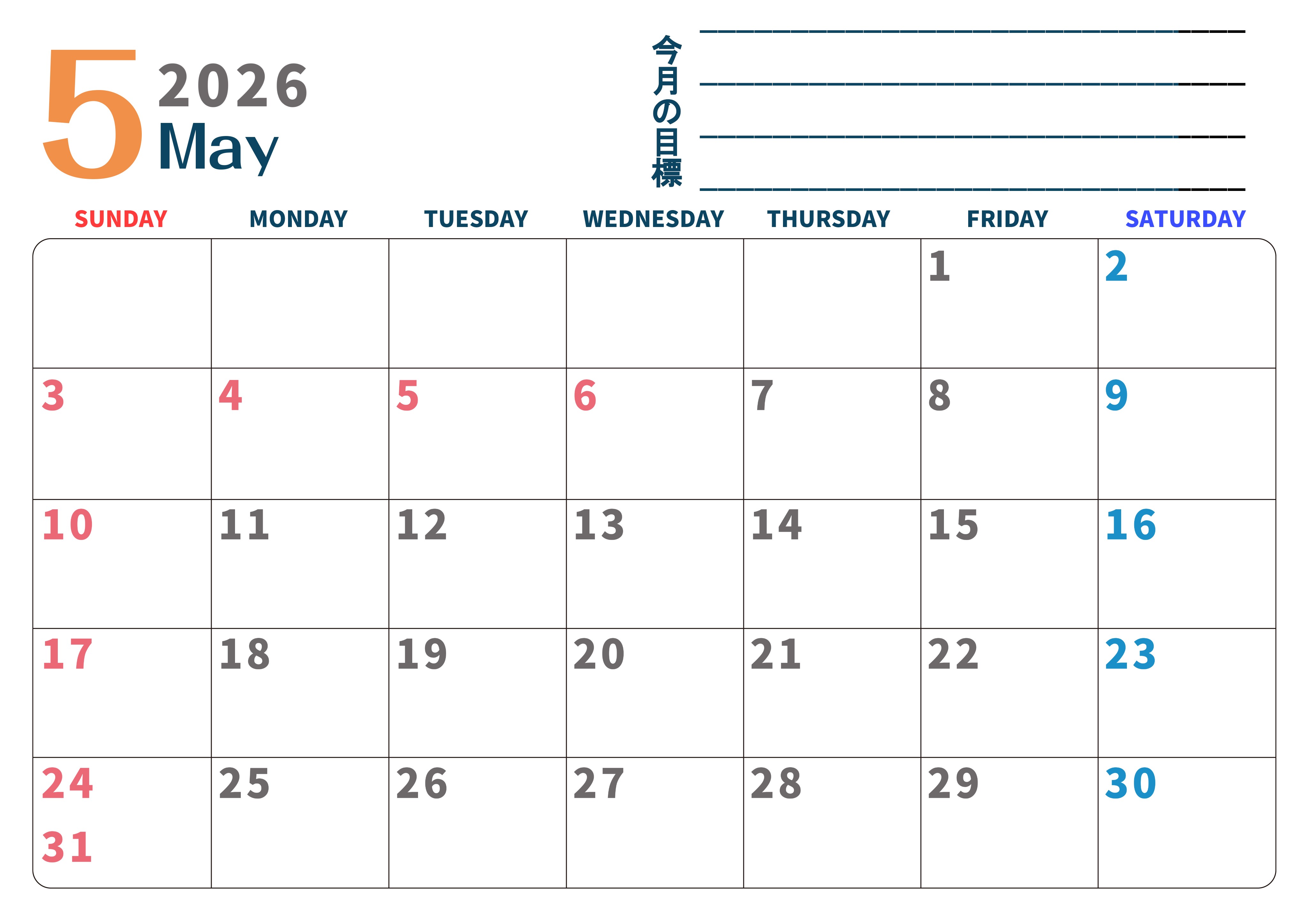 2026年・無料のカレンダーテンプレート 2026年5月カレンダーは横型日曜始まりで目標設定もできる無料ダウンロード素材!(2026-01510500) 素材状デザイン王 2025年4月13日 2026年5月カレンダーは横型日曜始まりで目標設定もできるので勉強や仕事のプランを立てるのに役立ちます。無料ダウンロードが簡単な素材です。(2026-01510500) 5月 横型のカレンダー 日曜始まり 目標 カレンダーデザイン-0151