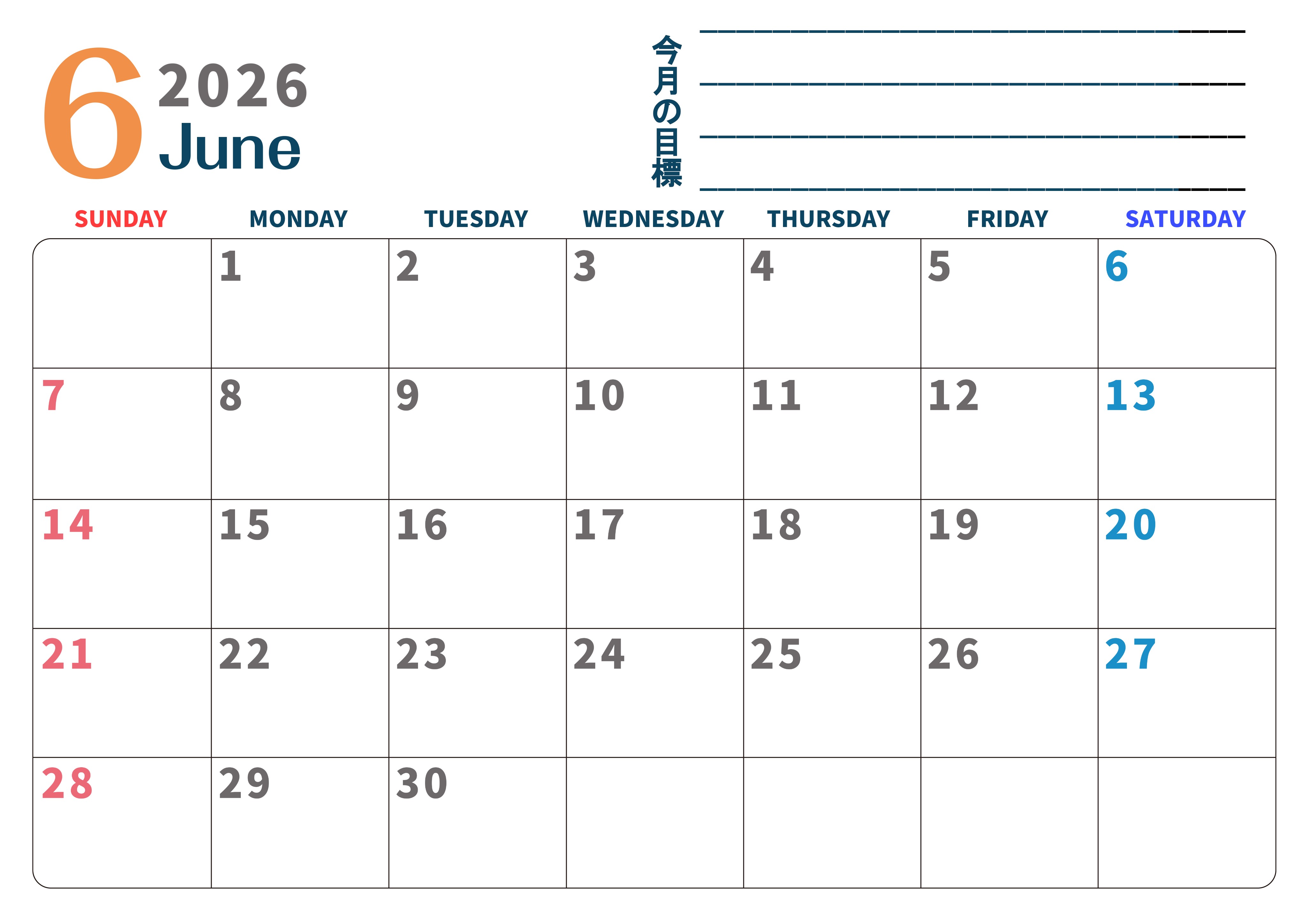 2026年6月カレンダーは横型日曜始まりで目標設定もできるので勉強や仕事のプランを立てるのに役立ちます。無料ダウンロードが簡単な素材です。(2026-01510600)