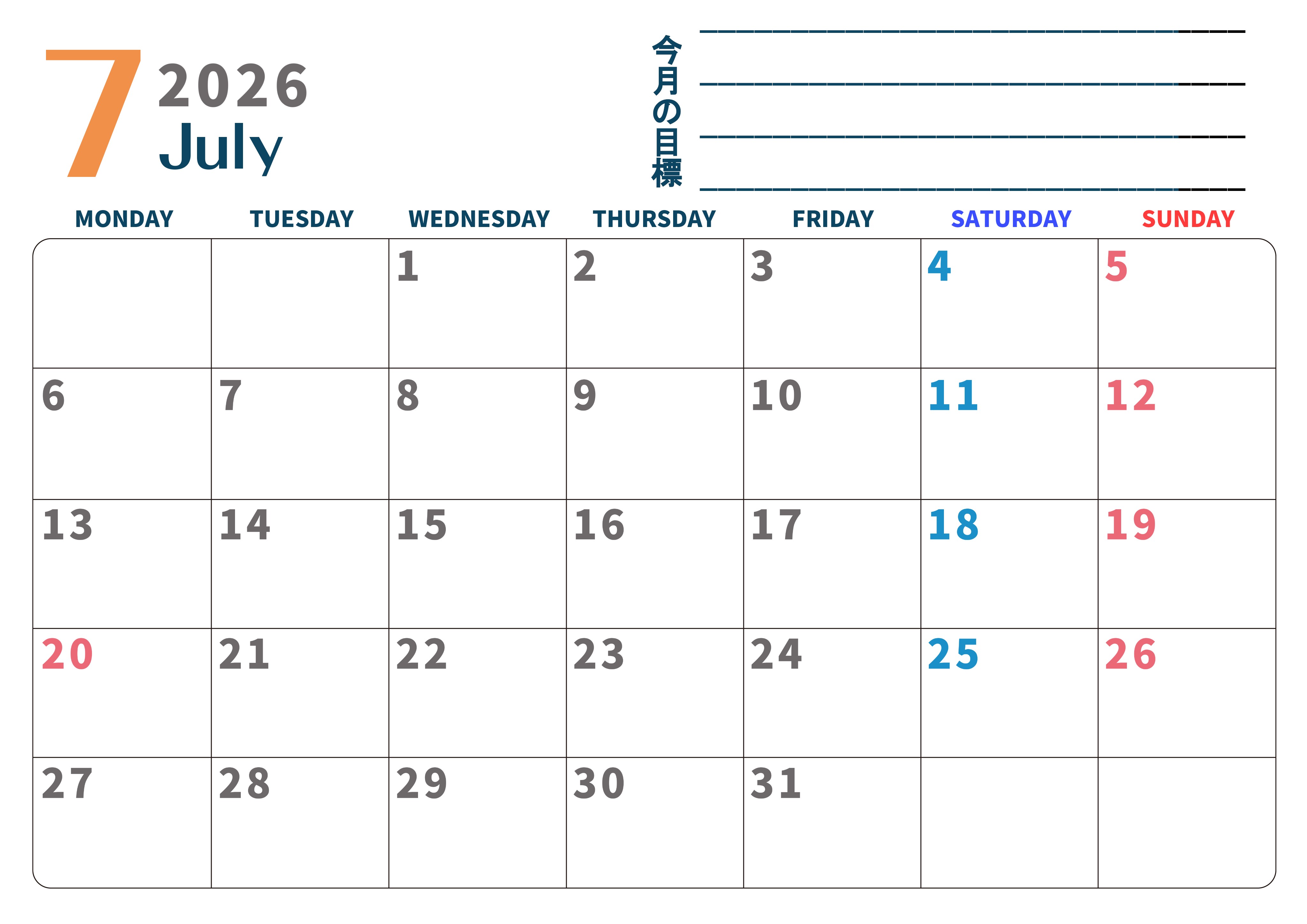 2026年7月カレンダーは横型月曜始まりで目標設定もできるので勉強や仕事のプランを立てるのに役立ちます。無料ダウンロードが簡単な素材です。(2026-01510701)