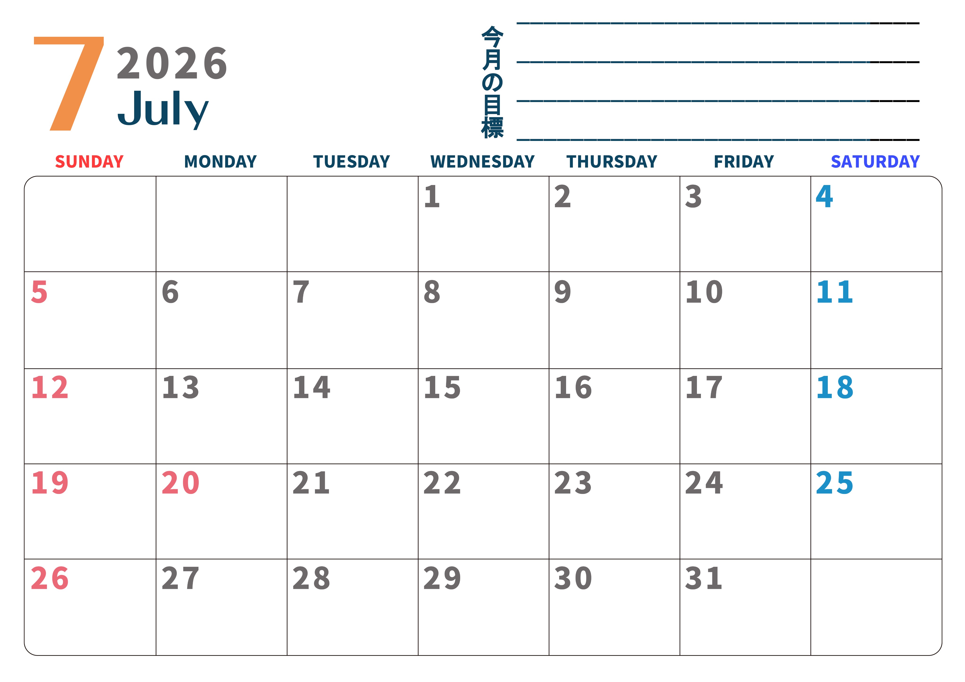 2026年7月カレンダーは横型日曜始まりで目標設定もできるので勉強や仕事のプランを立てるのに役立ちます。無料ダウンロードが簡単な素材です。(2026-01510700)