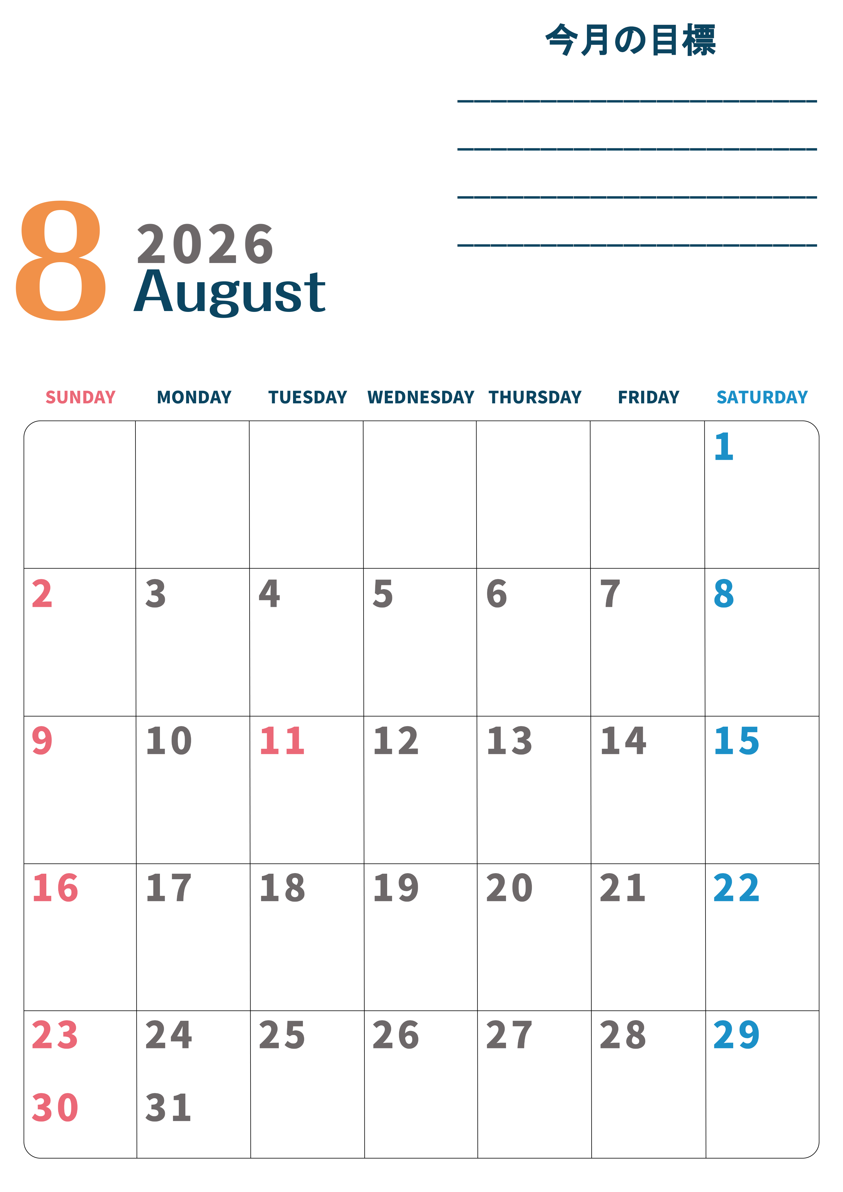 2026年・無料のカレンダーテンプレート 2026年8月カレンダーは縦型日曜始まりで目標設定もできる無料ダウンロード素材!(2026-01510810) 素材状デザイン王 2025年4月13日 2026年8月カレンダーは縦型日曜始まりで目標設定もできるので勉強や仕事のプランを立てるのに役立ちます。無料ダウンロードが簡単な素材です。(2026-01510810) 8月 縦型のカレンダー 日曜始まり 目標 カレンダーデザイン-0151