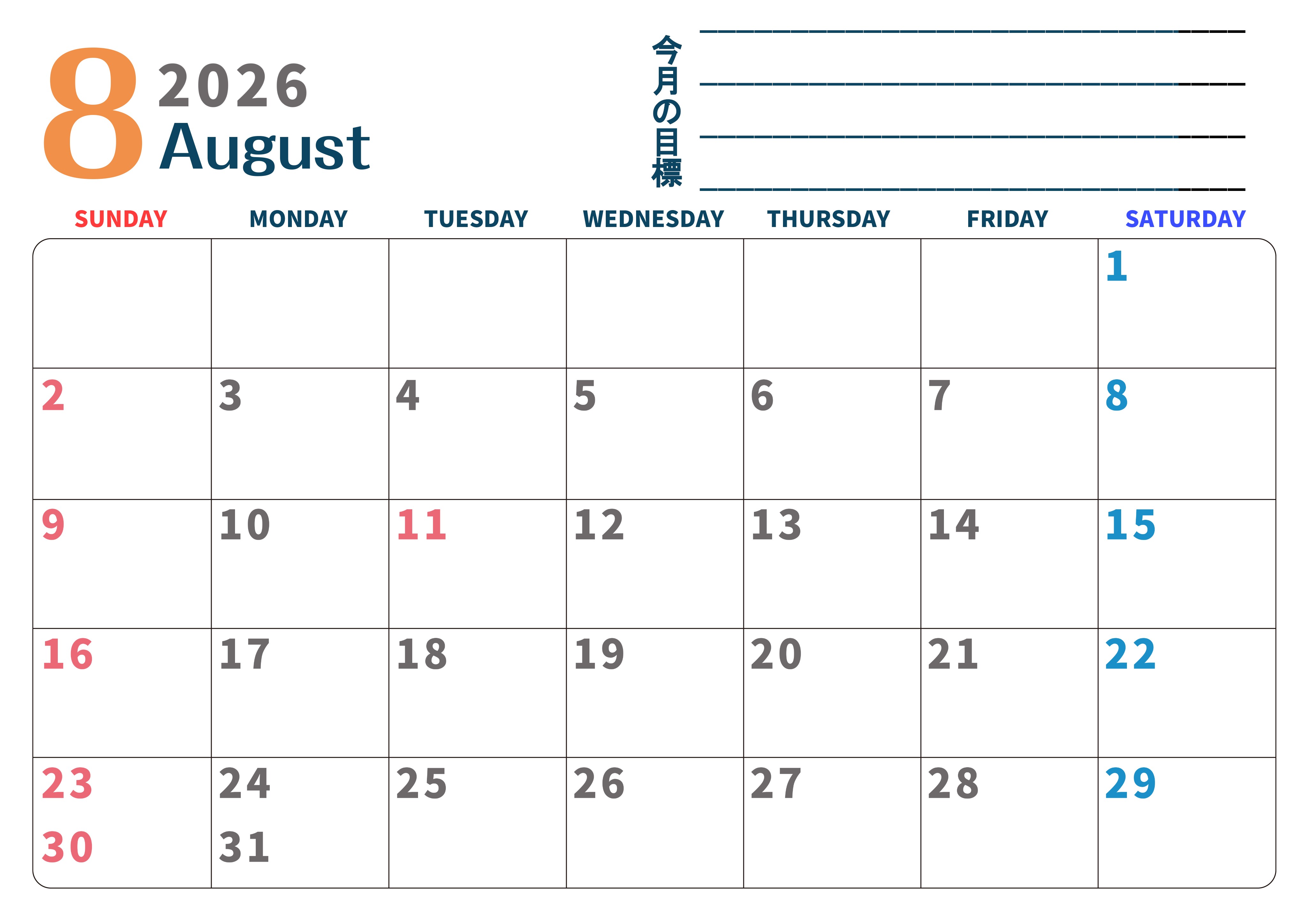 2026年8月カレンダーは横型日曜始まりで目標設定もできる無料ダウンロード素材!(2026-01510800)