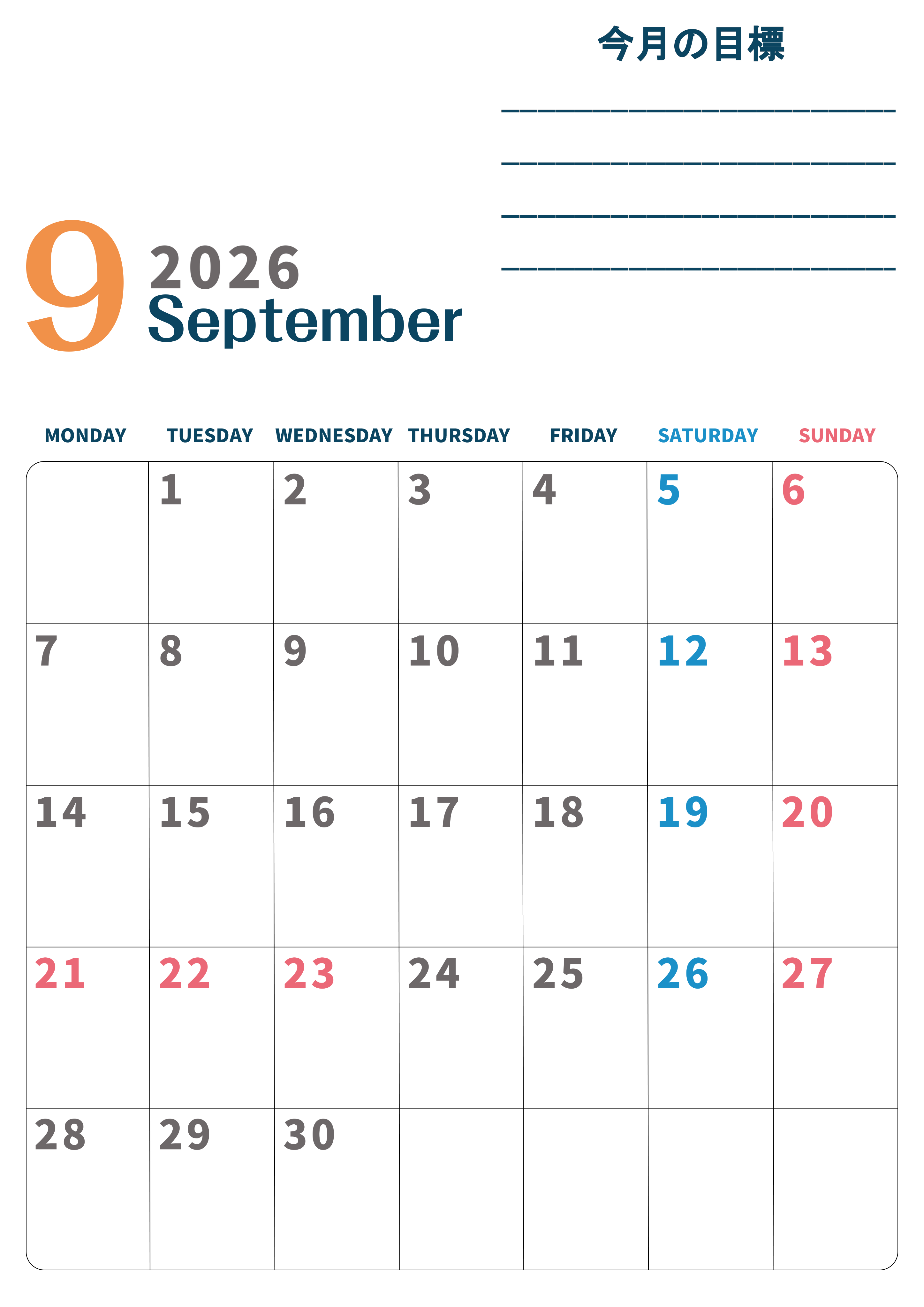 2026年・無料のカレンダーテンプレート 2026年9月カレンダーは縦型月曜始まりで目標設定もできる無料ダウンロード素材!(2026-01510911) 素材状デザイン王 2025年4月13日 2026年9月カレンダーは縦型月曜始まりで目標設定もできるので勉強や仕事のプランを立てるのに役立ちます。無料ダウンロードが簡単な素材です。(2026-01510911) 9月 縦型のカレンダー 月曜始まり 目標 カレンダーデザイン-0151