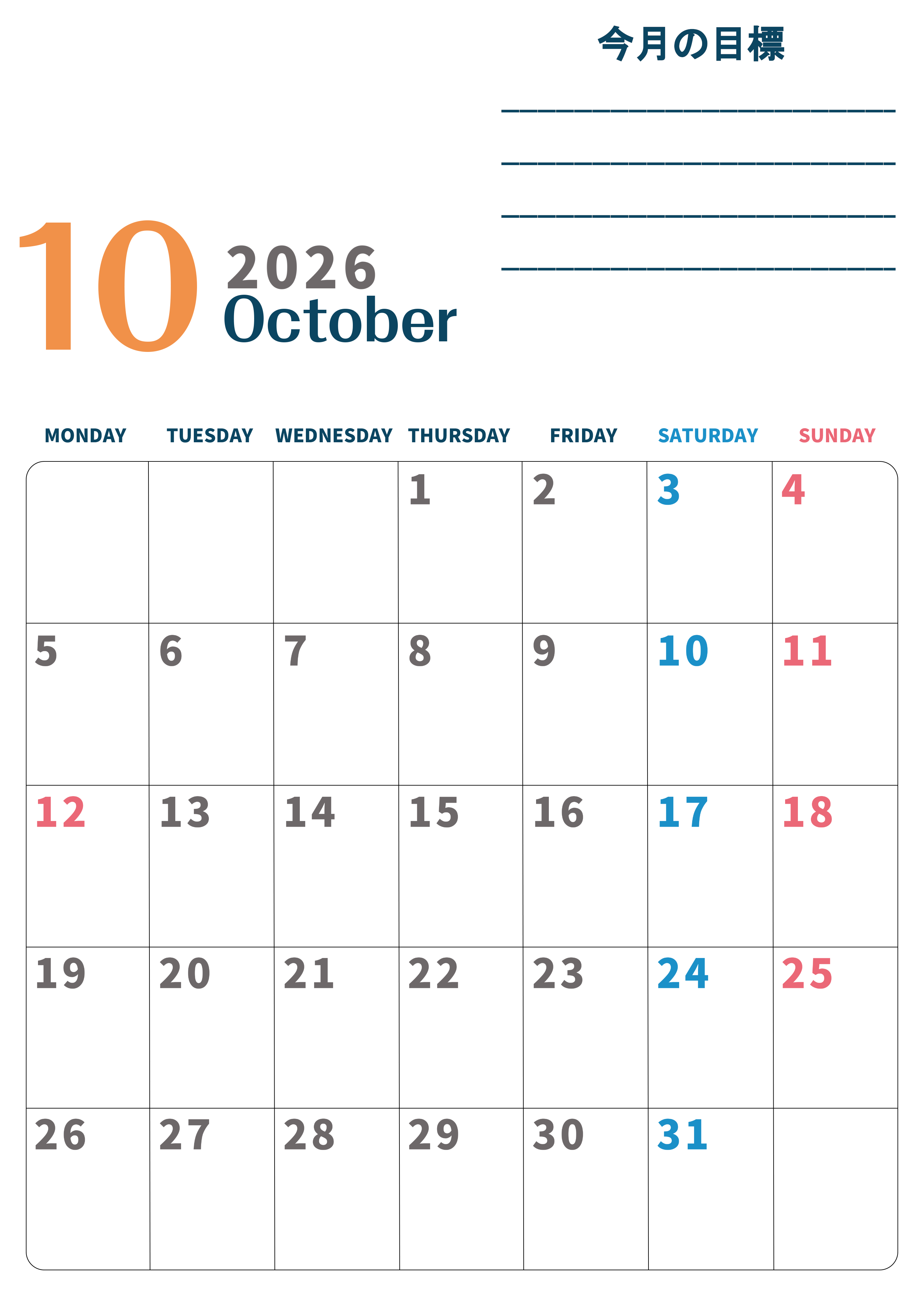 2026年10月カレンダーは縦型月曜始まりで目標設定もできる無料ダウンロード素材!(2026-01511011)
