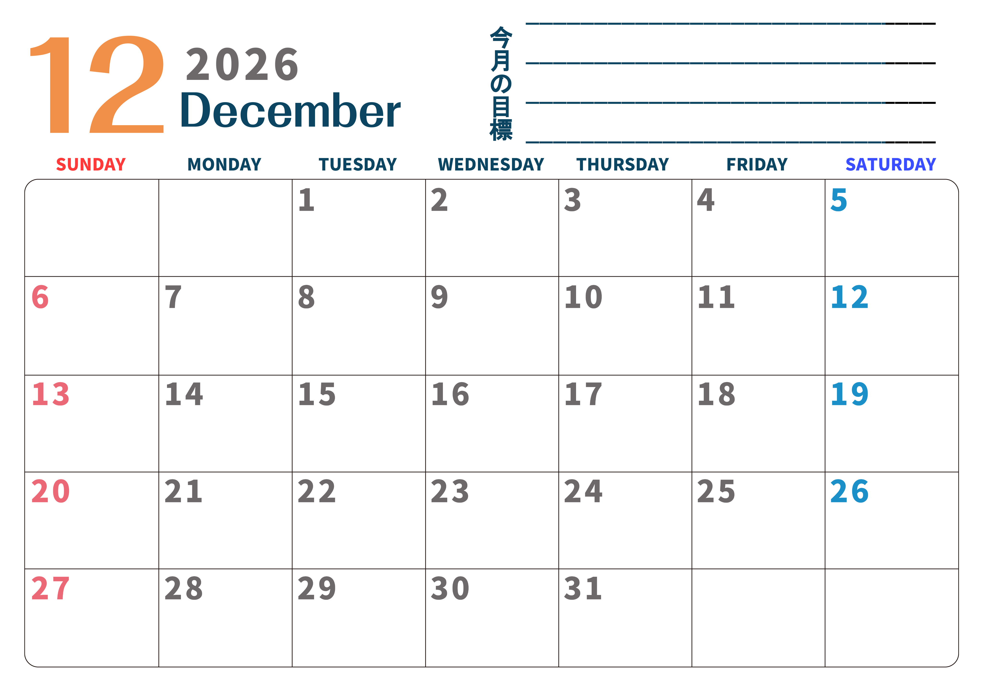 2026年・無料のカレンダーテンプレート 2026年12月カレンダーは横型日曜始まりで目標設定もできる無料ダウンロード素材!(2026-01511200) 素材状デザイン王 2025年4月13日 2026年12月カレンダーは横型日曜始まりで目標設定もできるので勉強や仕事のプランを立てるのに役立ちます。無料ダウンロードが簡単な素材です。(2026-01511200) 12月 横型のカレンダー 日曜始まり 目標 カレンダーデザイン-0151