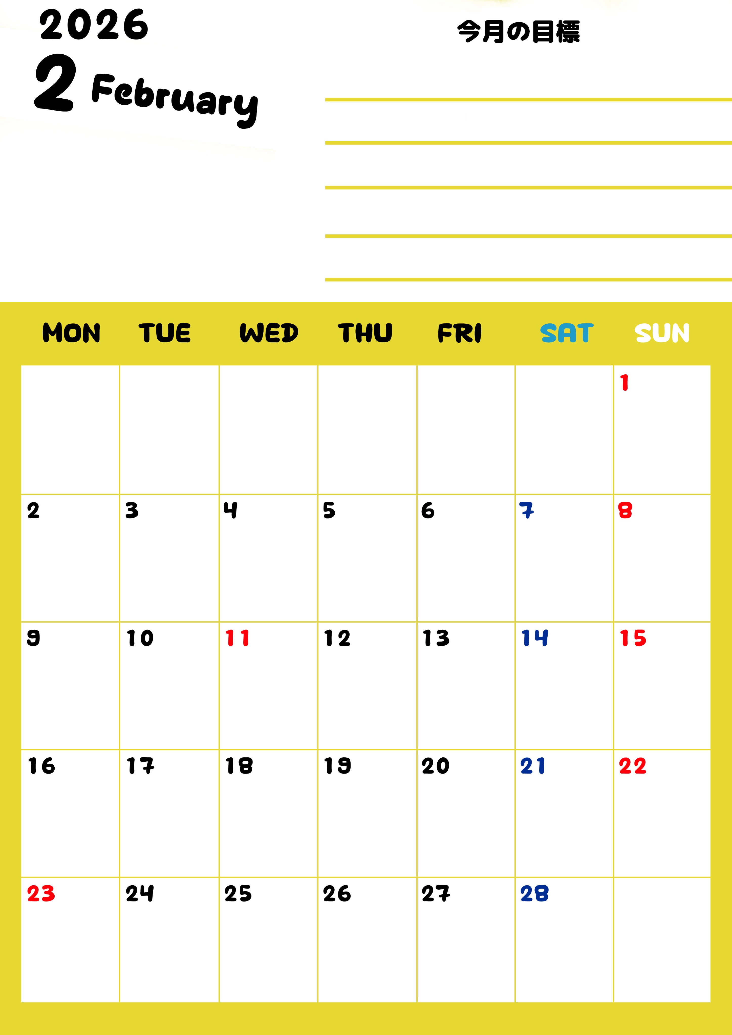 2026年2月カレンダーは縦型月曜始まりで目標管理がしやすい使いやすいです。無料ダウンロードして印刷しましょう。(2026-01520211)