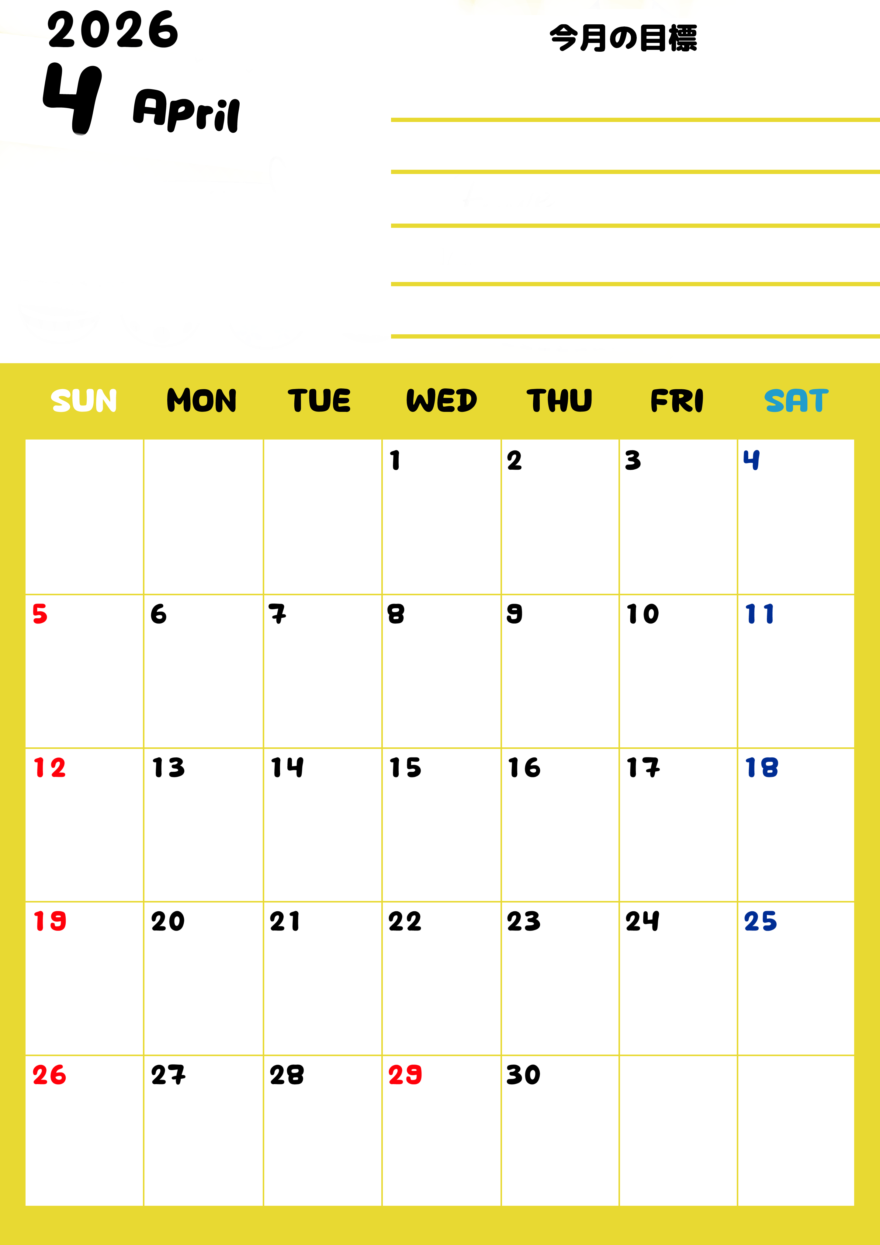 2026年・無料のカレンダーテンプレート 2026年4月カレンダーは縦型日曜始まりで目標管理しやすいし使いやすい♪無料/A4印刷(2026-01520410) 素材状デザイン王 2025年4月13日 2026年4月カレンダーは縦型日曜始まりで目標管理がしやすい使いやすいです。無料ダウンロードして印刷しましょう。(2026-01520410) 4月 縦型のカレンダー 日曜始まり 目標 カレンダーデザイン-0152