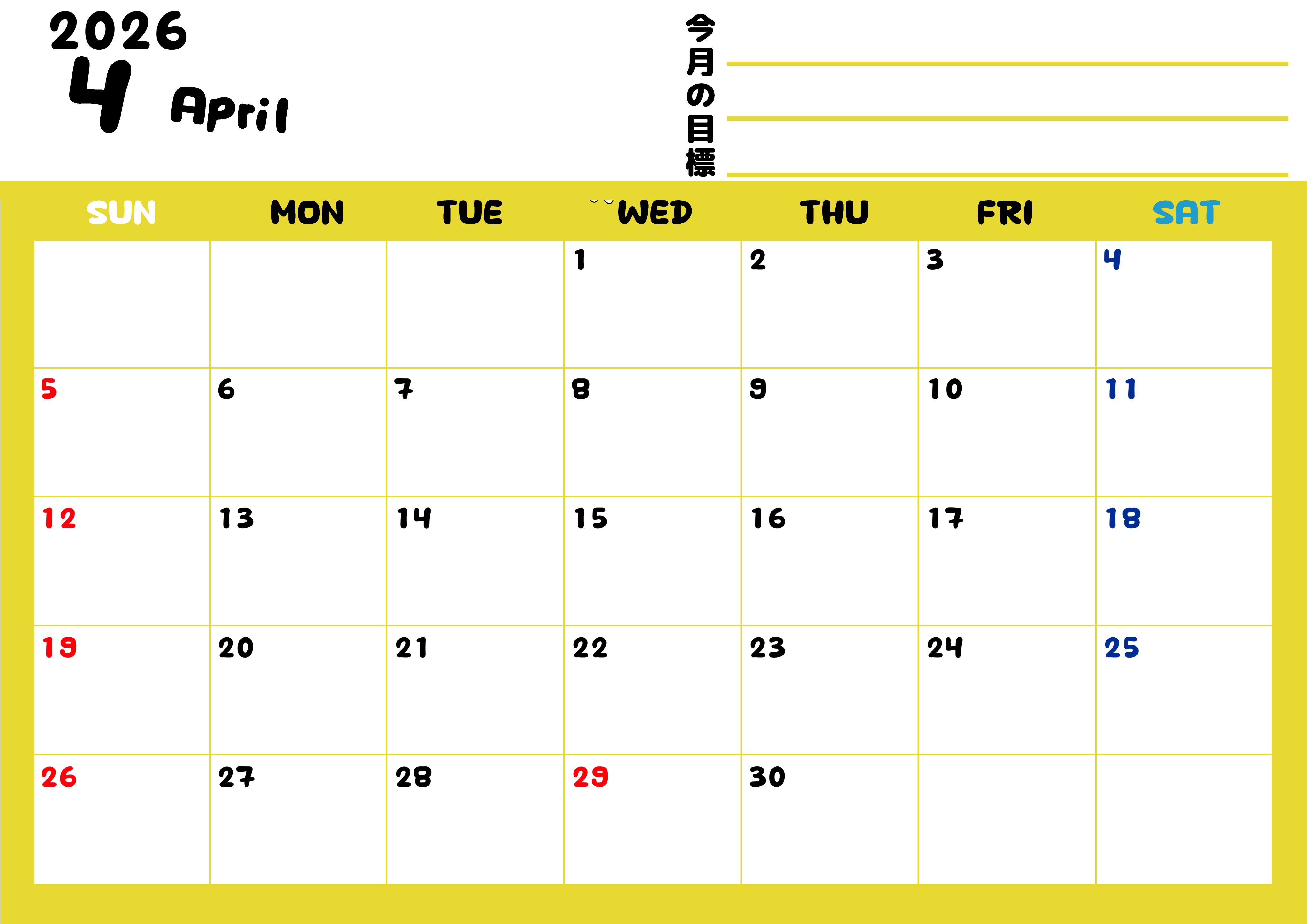 2026年4月カレンダーは横型日曜始まりで目標管理しやすいし使いやすい♪無料/A4印刷(2026-01520400)