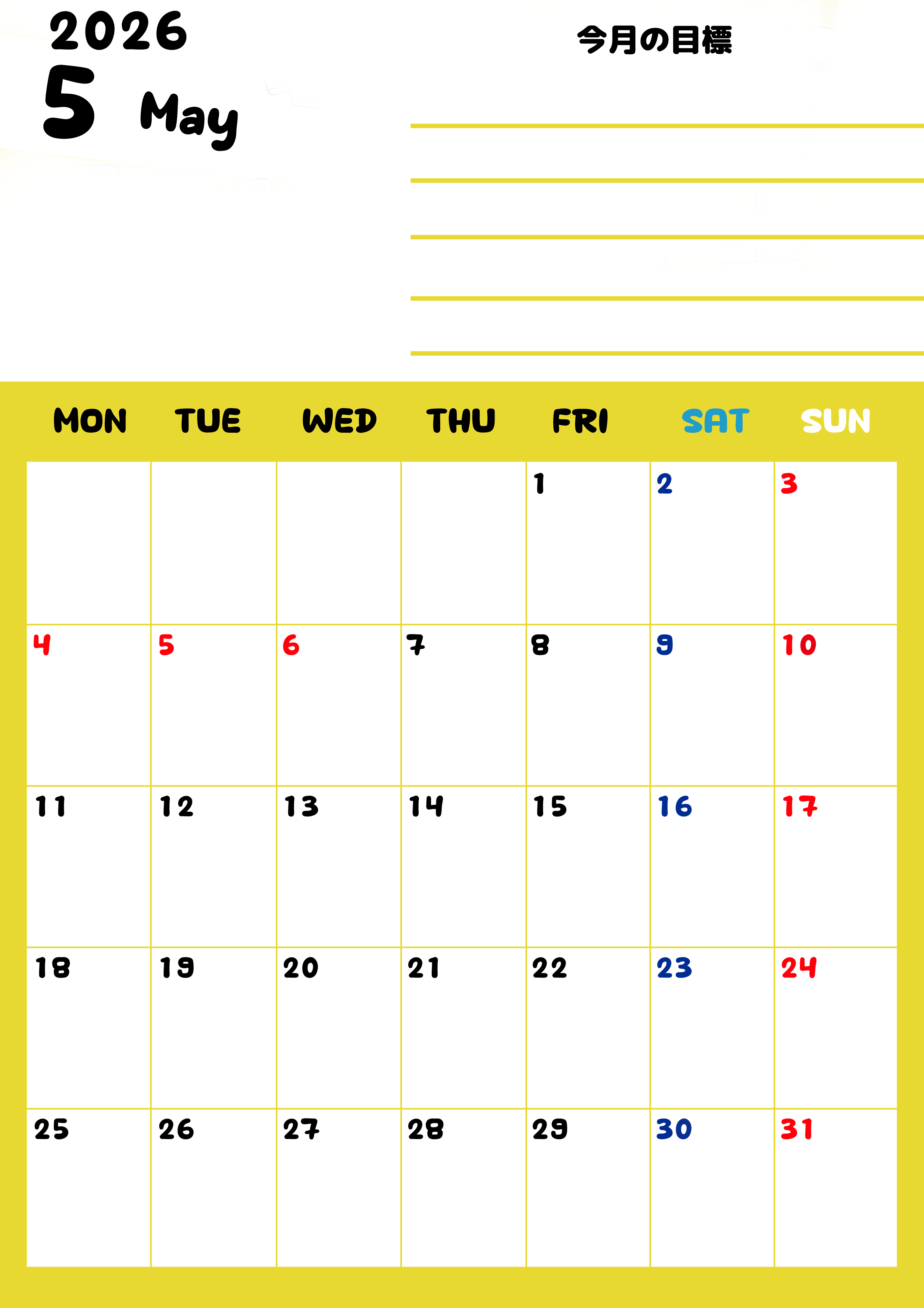 2026年・無料のカレンダーテンプレート 2026年5月カレンダーは縦型月曜始まりで目標管理しやすいし使いやすい♪無料/A4印刷(2026-01520511) 素材状デザイン王 2025年4月13日 2026年5月カレンダーは縦型月曜始まりで目標管理がしやすい使いやすいです。無料ダウンロードして印刷しましょう。(2026-01520511) 5月 縦型のカレンダー 月曜始まり 目標 カレンダーデザイン-0152