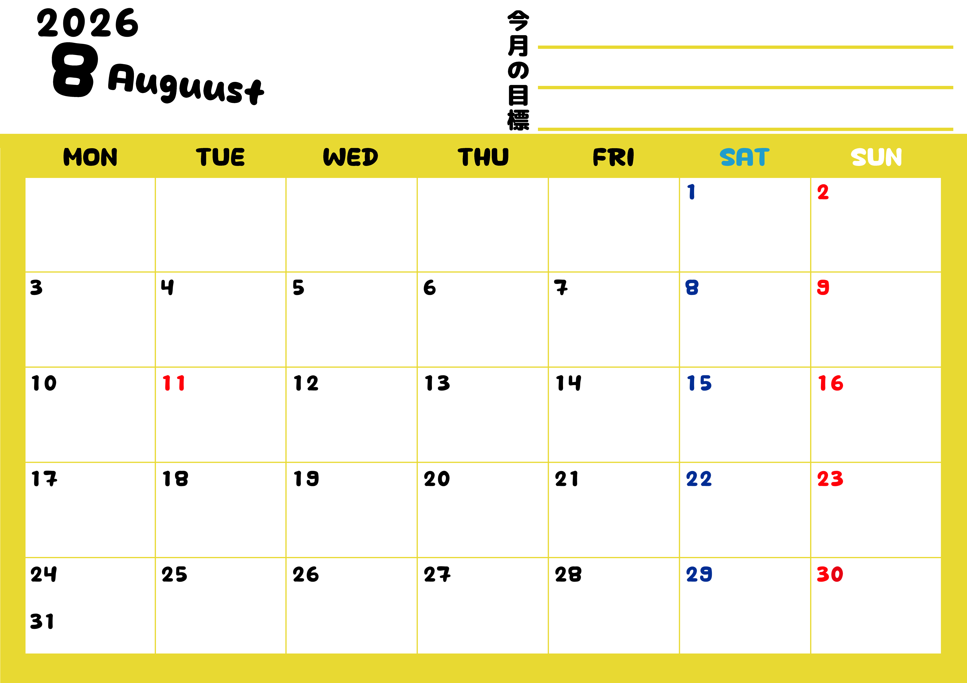 2026年・無料のカレンダーテンプレート 2026年8月カレンダーは横型月曜始まりで目標管理しやすいし使いやすい♪無料/A4印刷(2026-01520801) 素材状デザイン王 2025年4月13日 2026年8月カレンダーは横型月曜始まりで目標管理がしやすい使いやすいです。無料ダウンロードして印刷しましょう。(2026-01520801) 8月 横型のカレンダー 月曜始まり 目標 カレンダーデザイン-0152