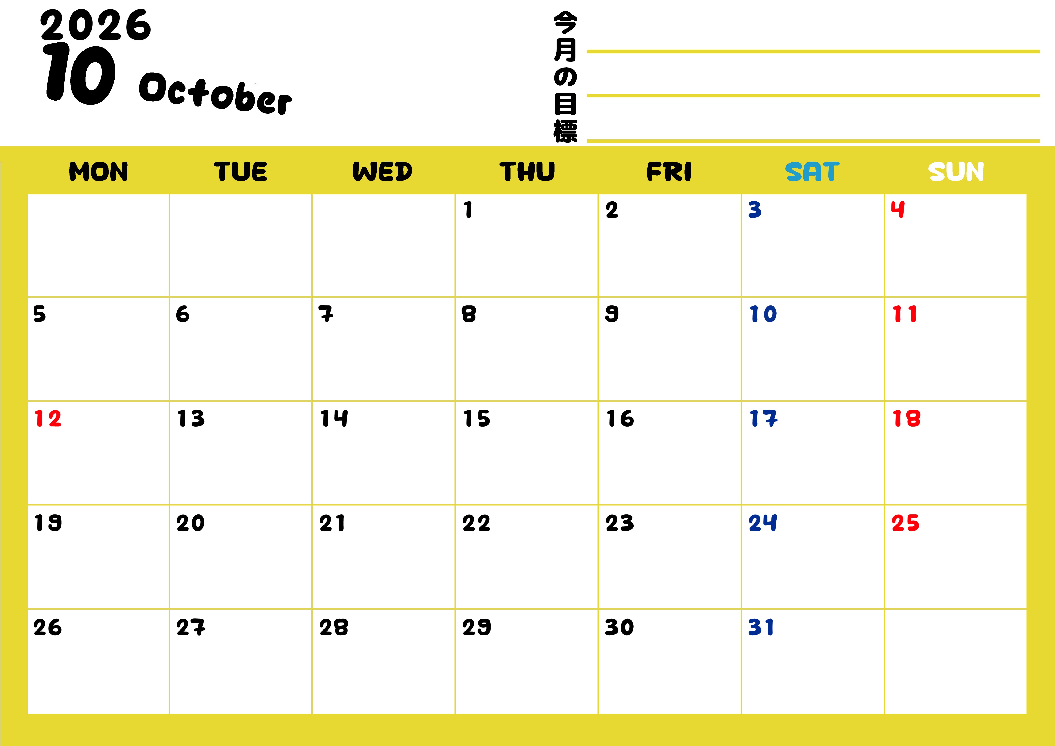 2026年・無料のカレンダーテンプレート 2026年10月カレンダーは横型月曜始まりで目標管理しやすいし使いやすい♪無料/A4印刷(2026-01521001) 素材状デザイン王 2025年4月13日 2026年10月カレンダーは横型月曜始まりで目標管理がしやすい使いやすいです。無料ダウンロードして印刷しましょう。(2026-01521001) 10月 横型のカレンダー 月曜始まり 目標 カレンダーデザイン-0152
