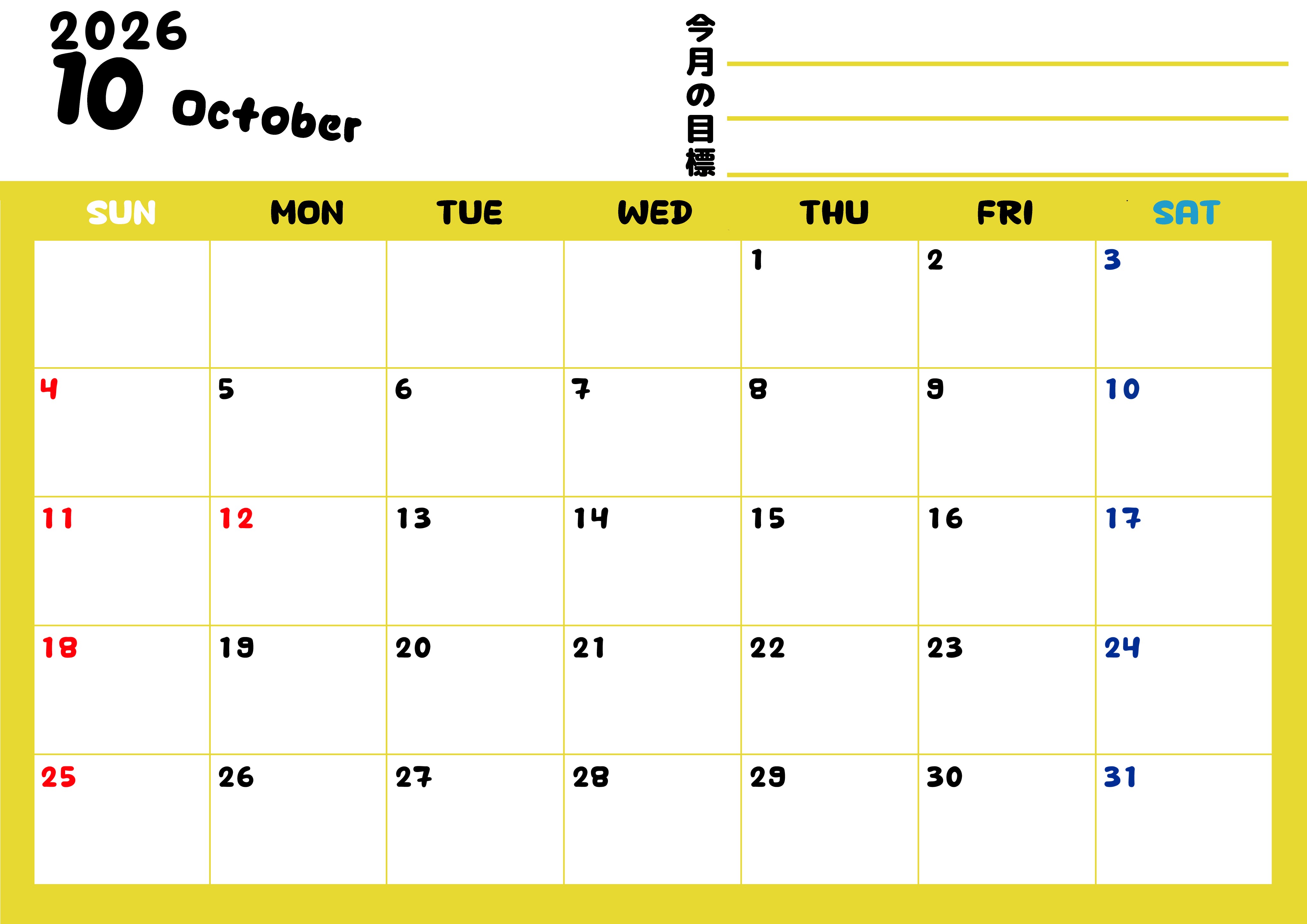 2026年10月カレンダーは横型日曜始まりで目標管理がしやすい使いやすいです。無料ダウンロードして印刷しましょう。(2026-01521000)