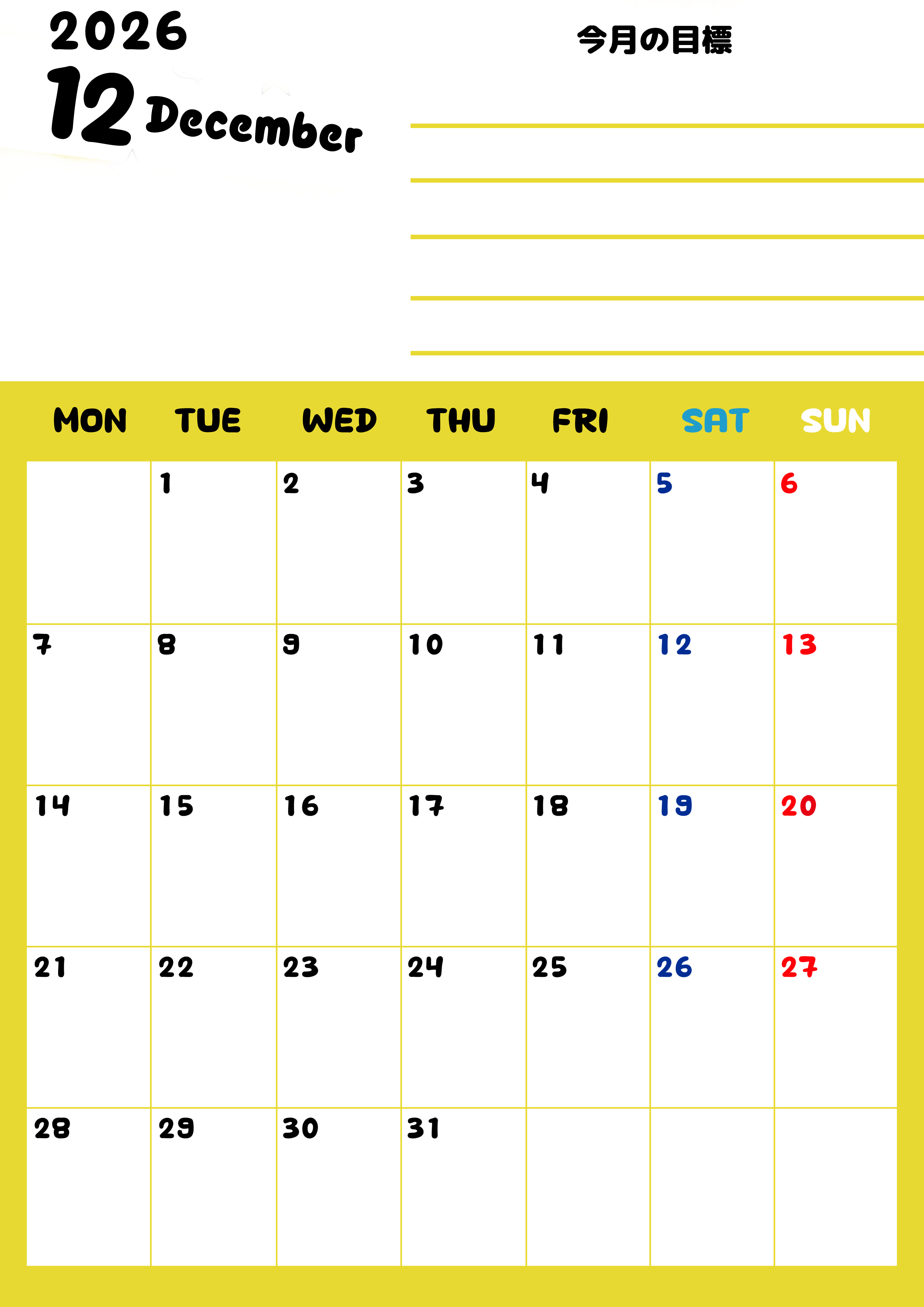 2026年12月カレンダーは縦型月曜始まりで目標管理しやすいし使いやすい♪無料/A4印刷(2026-01521211)