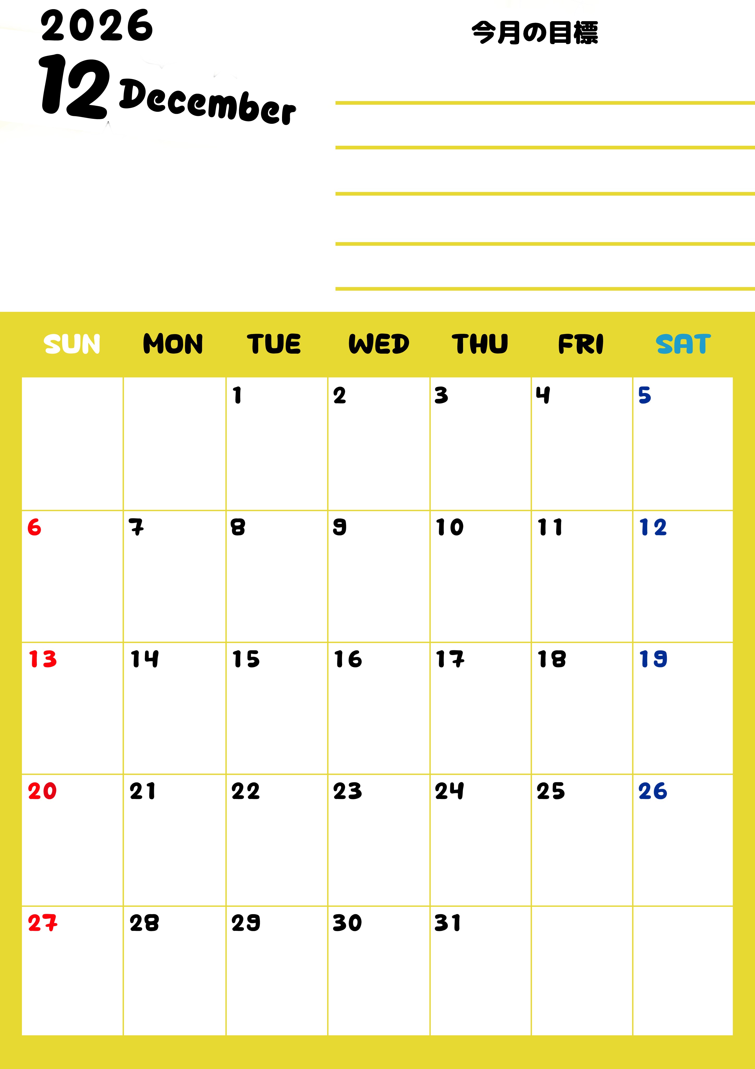 2026年12月カレンダーは縦型日曜始まりで目標管理しやすいし使いやすい♪無料/A4印刷(2026-01521210)