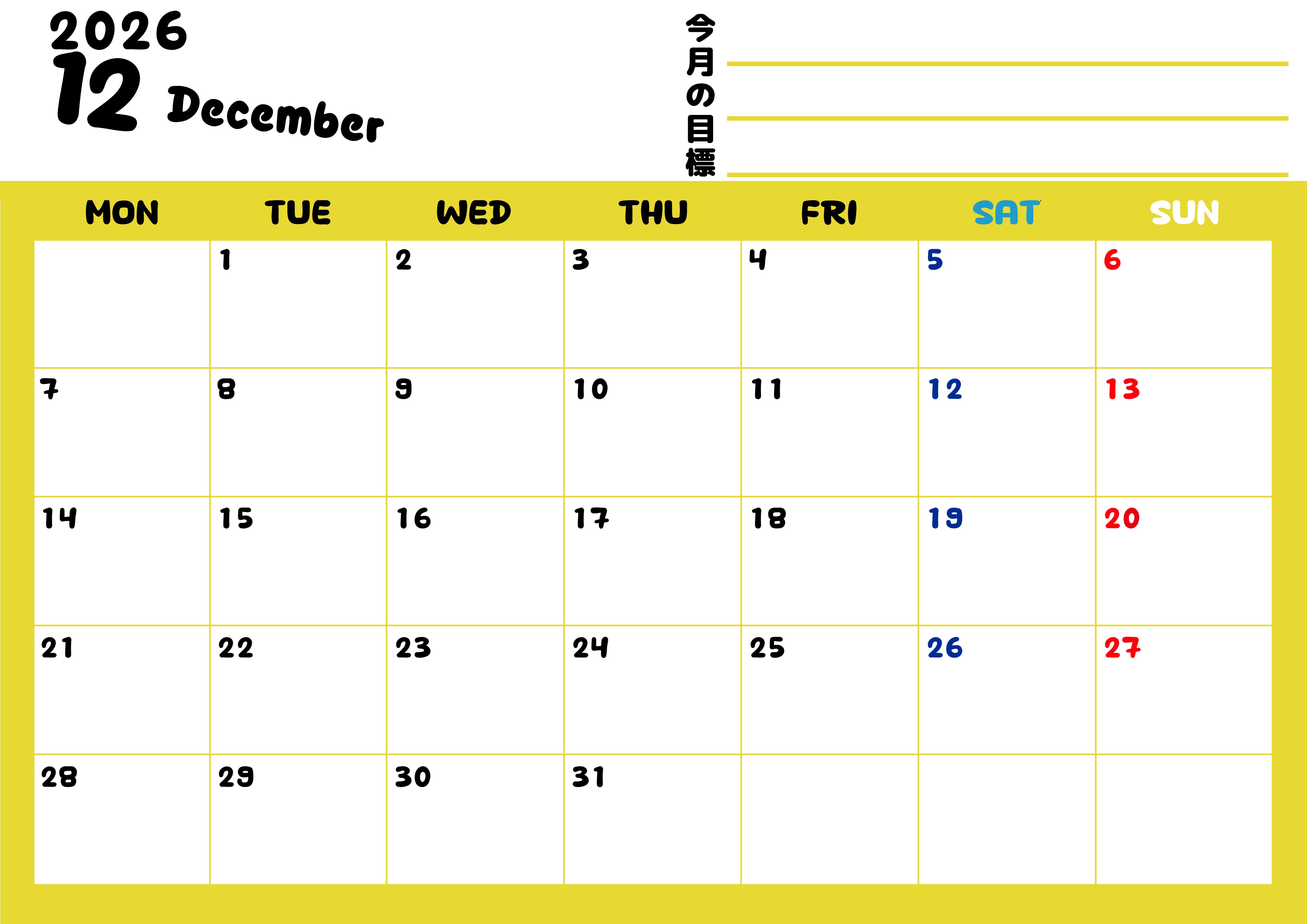2026年12月カレンダーは横型月曜始まりで目標管理しやすいし使いやすい♪無料/A4印刷(2026-01521201)