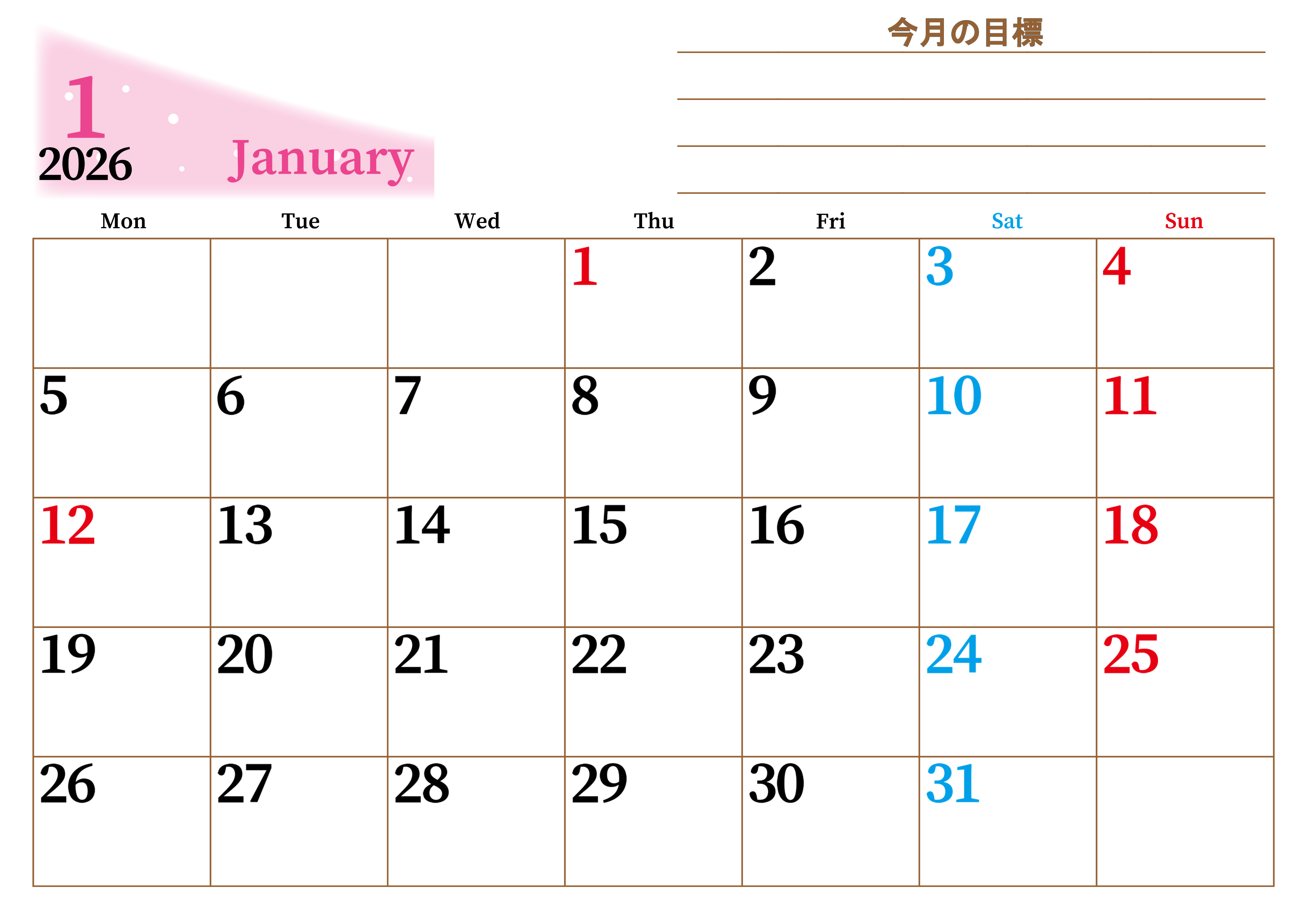 2026年1月カレンダーは横型月曜始まりで目標管理におすすめです。勉強を継続するのに最適です。A4用紙に印刷をしましょう。無料ダウンロードしましょう。(2026-01530101)