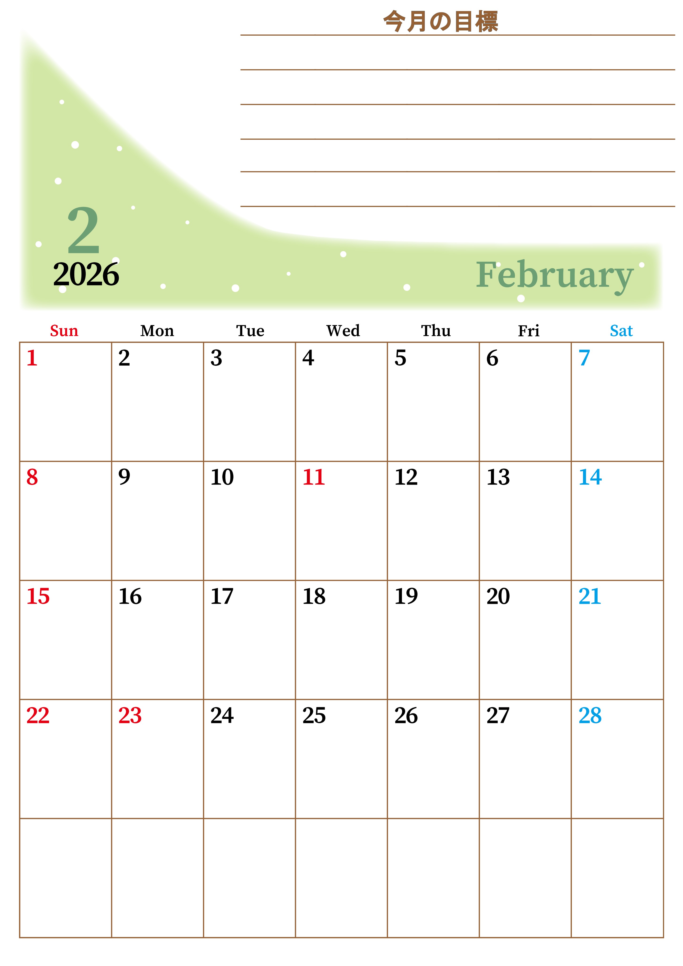 2026年・無料のカレンダーテンプレート 2026年2月カレンダーは縦型日曜始まりで目標管理におすすめ♪勉強を継続するのに最適:無料(2026-01530210) 素材状デザイン王 2025年4月13日 2026年2月カレンダーは縦型日曜始まりで目標管理におすすめです。勉強を継続するのに最適です。A4用紙に印刷をしましょう。無料ダウンロードしましょう。(2026-01530210) 2月 縦型のカレンダー 日曜始まり 目標 カレンダーデザイン-0153
